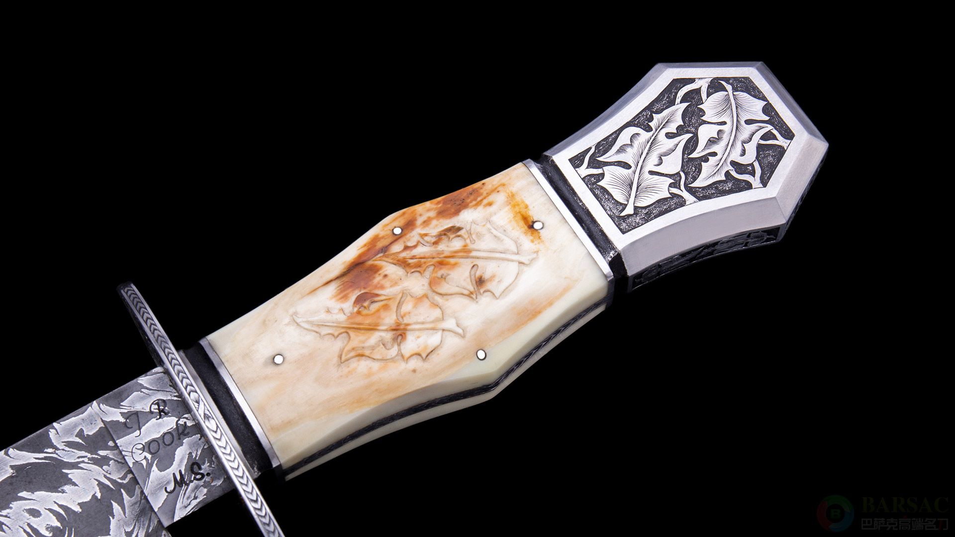 手柄采用精品海象牙化石制成,卧感柔滑细腻,手柄正面也雕刻了写意的卷叶浮雕。尾铁棱角分明,同样也是被全方位的雕刻图案所包围,树叶与橡果图案使得细节更加丰富多彩。整刀显示出高超的艺术性同时又保留了原始美国博伊的粗犷之美。配有手工刀鞘,詹姆斯作品近年来一直是国内收藏的热门,如此精品更是ABS爱好者的不二之选。