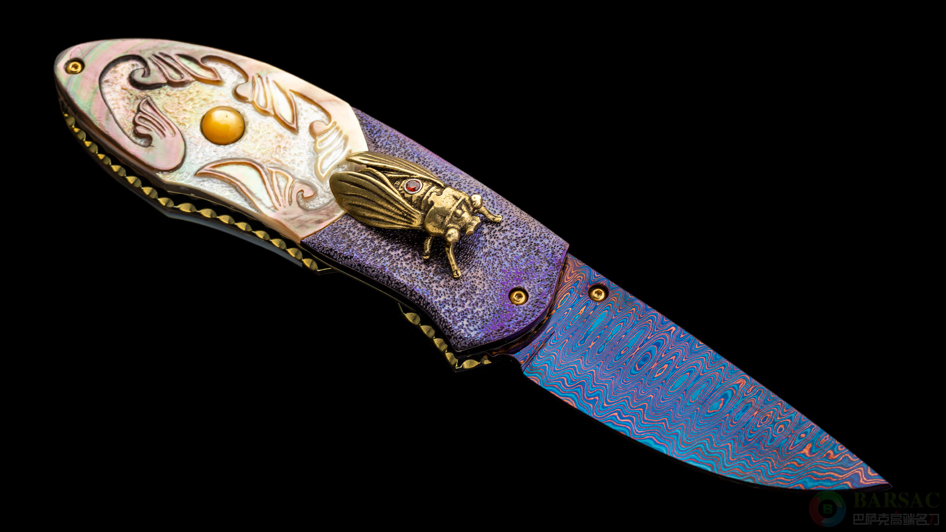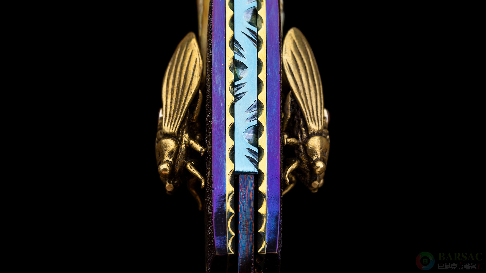 这款仲夏月夜作品刀刃采用烤蓝大马士革制成,花纹动感,色彩艳丽,搭配宝石推钮,开合顺滑。手柄采用中碳钢与深海黑贝母制作而成,金属部分做了肌理雕刻并烤蓝处理,上方采用铜雕刻了一只生动活泼的金蝉,金蝉镶嵌宝石装饰,在浩瀚的夜空之下继续着它的恋曲。