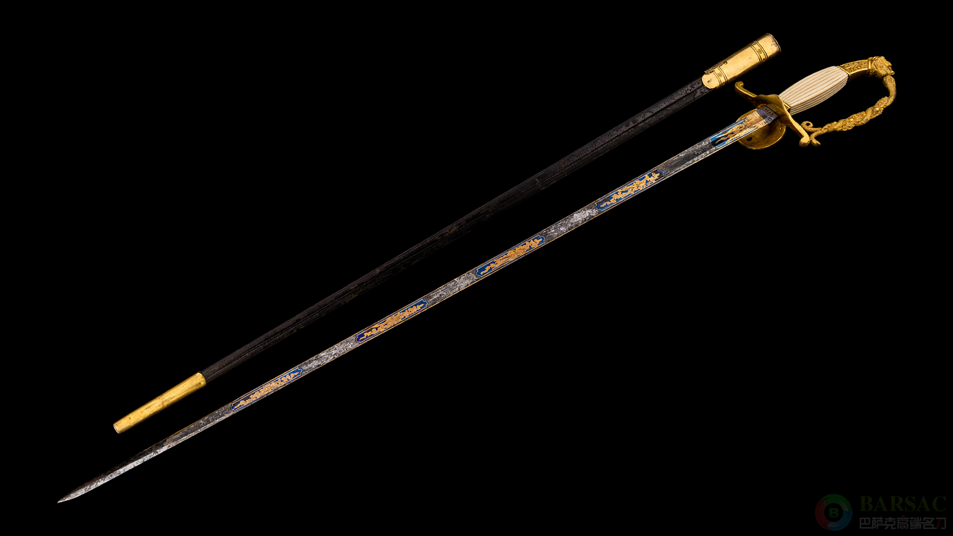 这把坎达品相优异尺寸庞大,全长110.5厘米,刃长76厘米,裸重1323克。修长的刀刃采用大马士革钢打造,花纹细密连贯,刀刃带有数道刀槽,魄力十足。D型碗装手柄采用碳钢打造而成,再加上大量的白银妆点,富丽堂皇。