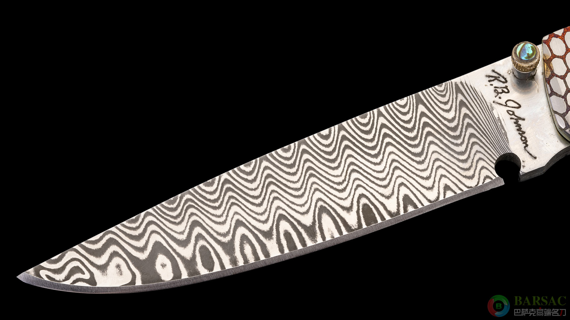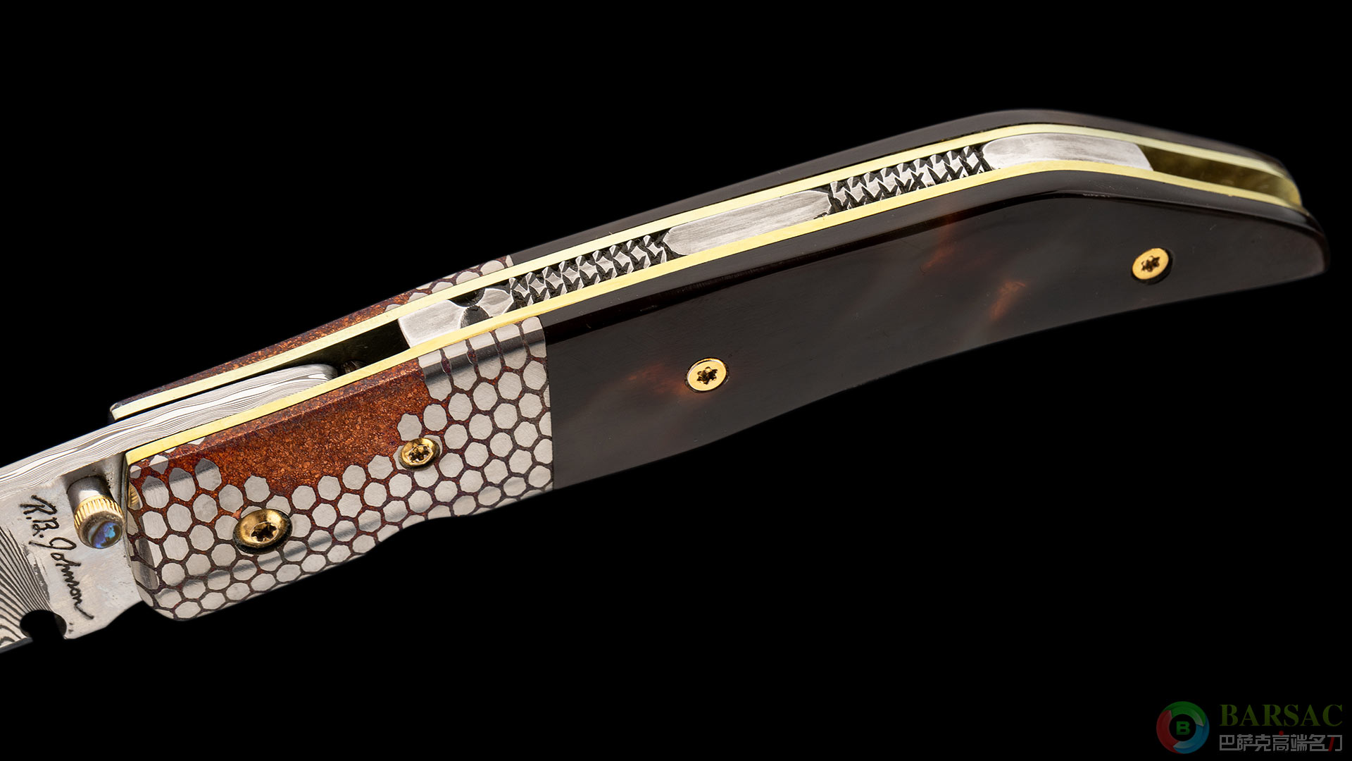 美国刀匠协会老牌名匠罗纳德·江森手工制作,孤品唯一。罗纳德1972年开始做刀,现年已经78岁,仍然活力充沛,制作各种刀剑的同时也活跃于各大展会。罗纳德最擅长制作精美的折刀作品,其作品时常刊登在国外杂志上。