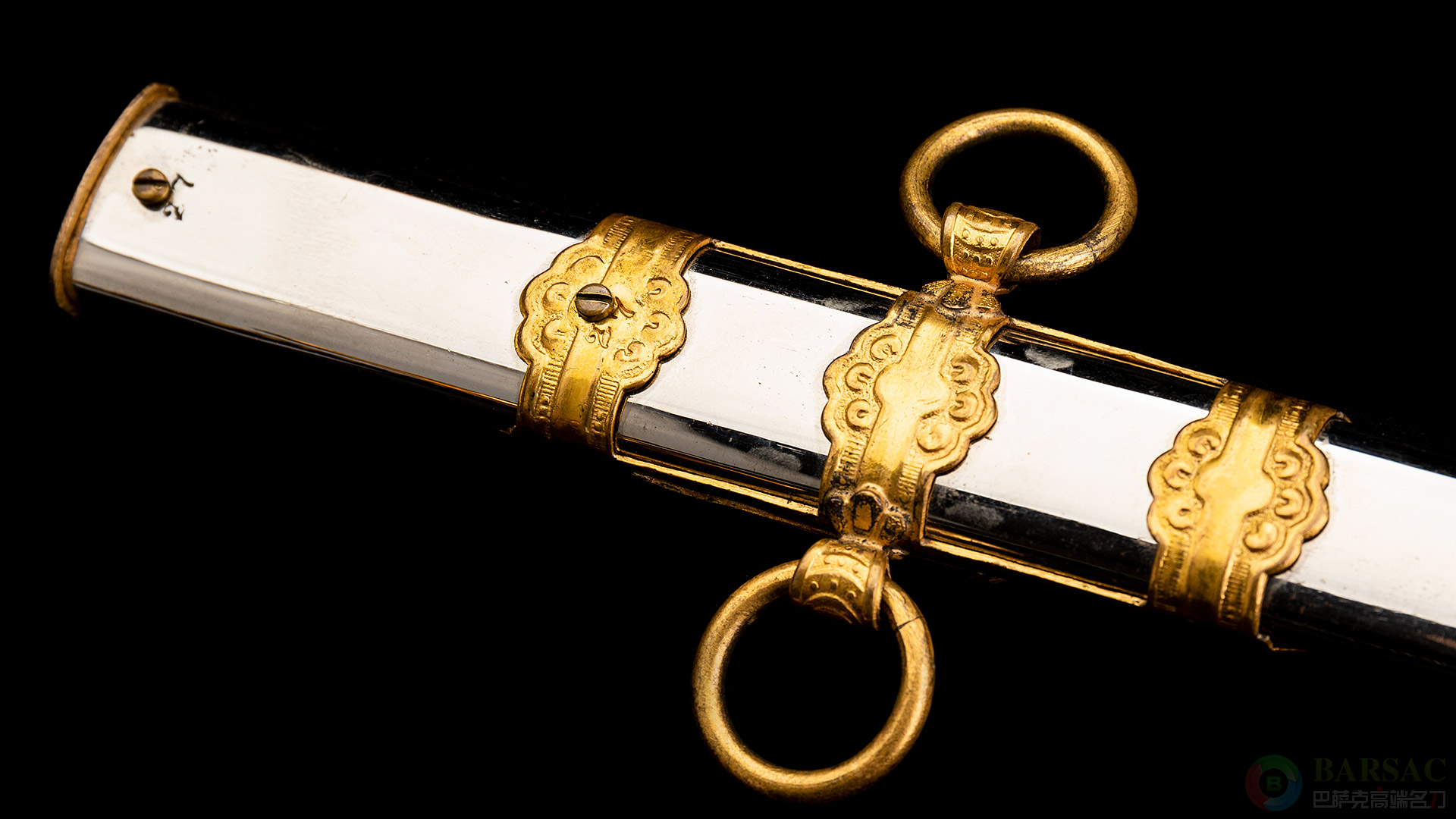19世纪末期左右美国出品,为成员出席公众场合或者仪式佩戴的宝剑。共济会可谓大名鼎鼎,其成员更是包括数位总统,大商富豪,影响力很大。此款共济会佩剑配置奢华,全长86.5厘米,刃长67厘米,裸重566克。剑刃笔直修长,带有精美蚀刻图案并镀金处理。大气精美的护手,满浮雕装饰,并镀金处理,剑柄采用木柄包裹皮革缠绕铜丝镀金制成,尾部为地球浮雕。