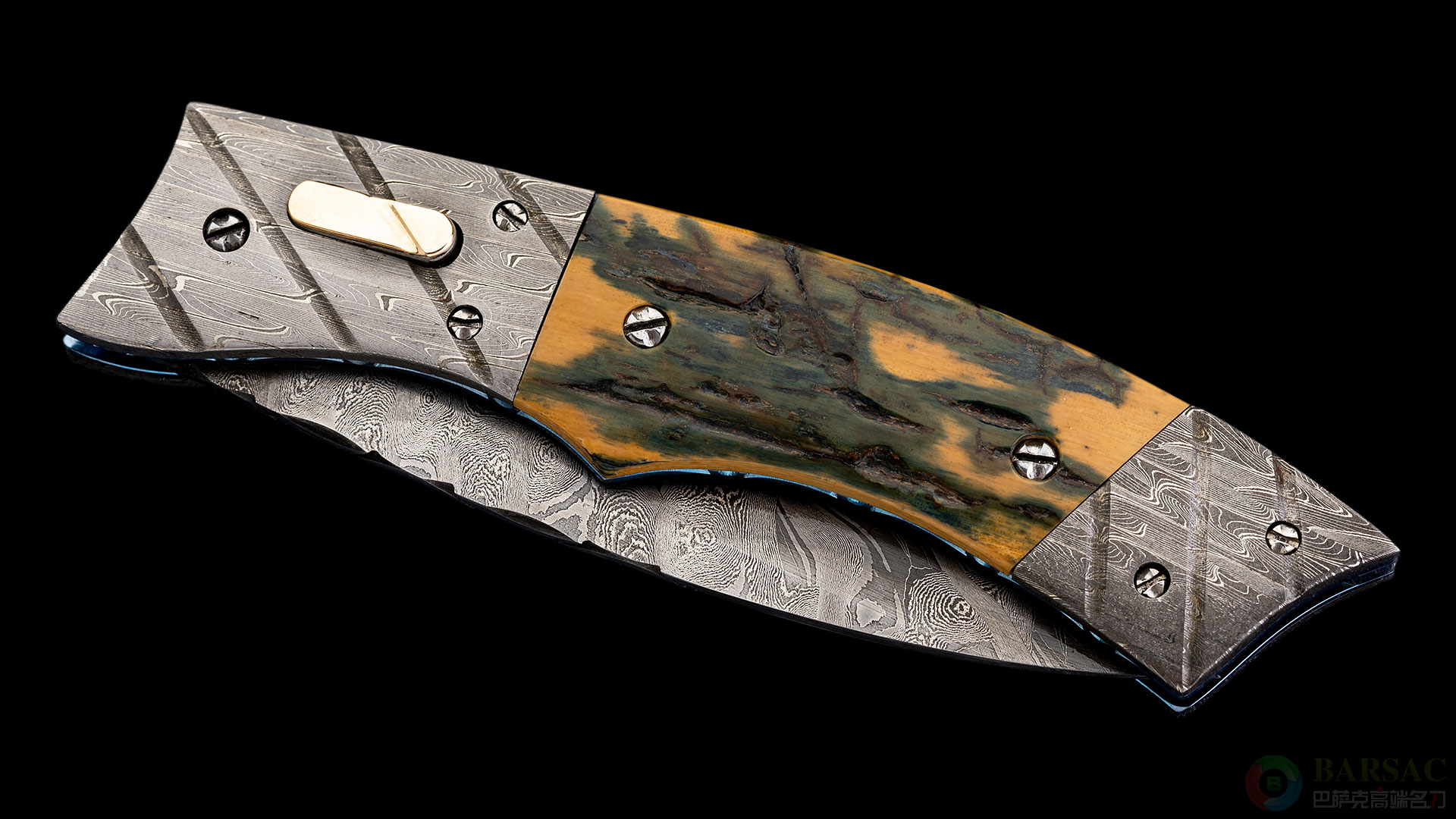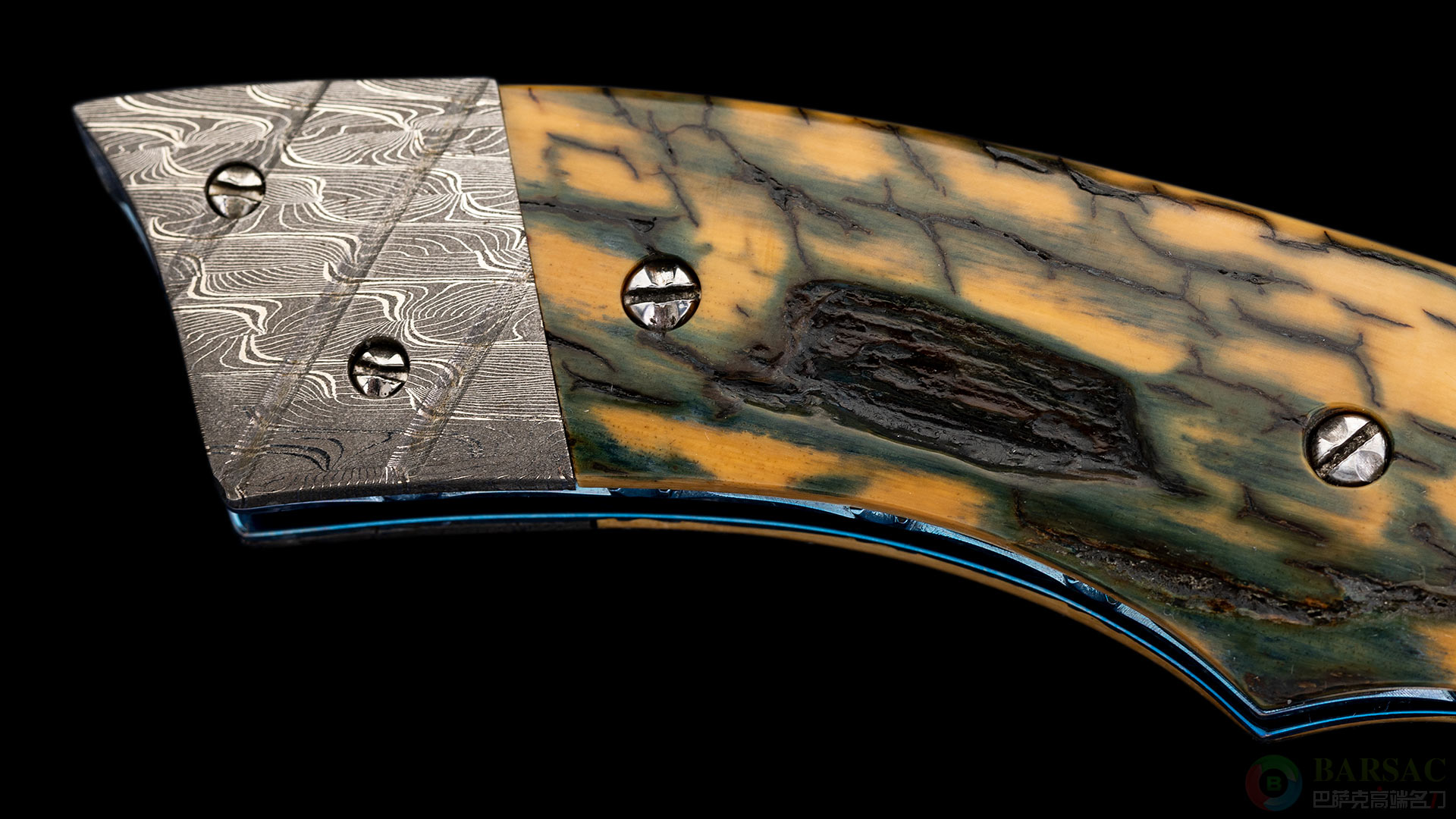 这件极地龙卷作品刀刃采用极为抢眼的水龙卷大马士革制成,花纹卷曲生动,细节精细,气魄十足。刀柄采用精美大马士革与猛犸牙化石贴片制成,开刀钮为黄金制成,大气尊贵。开刀迅猛有力,声响悦耳。
