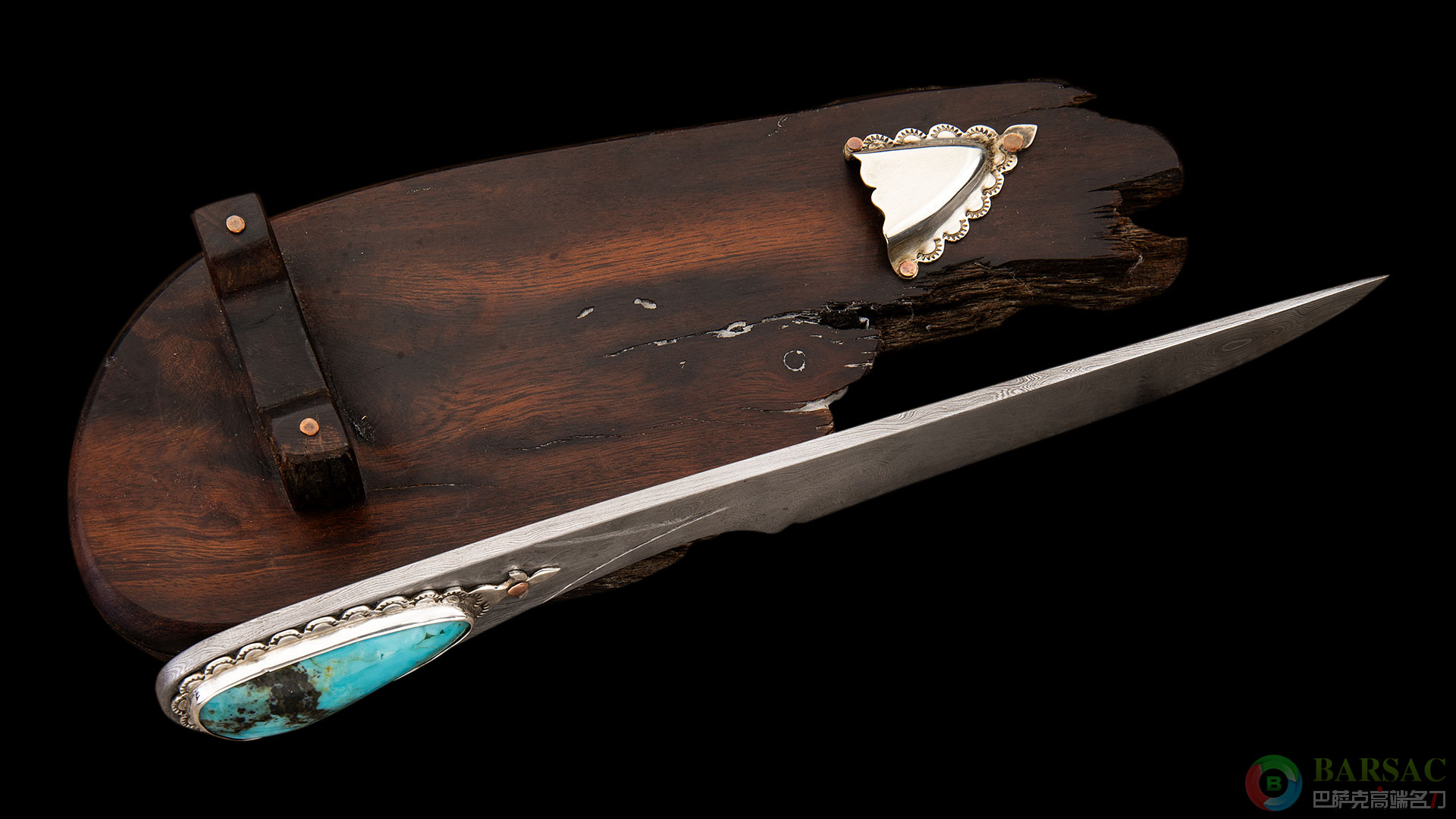 这件作品是拉瑞少有的古典桌刀,刀刃采用拉瑞锻造大马士革制作,花纹细密连贯,富有变化。刀柄上拉瑞手工方式制作了锉花底座,上面镶嵌了大克拉的绿松石。作品带有拉瑞制作的木制底座陈列,韵味十足。整件作品外观非常简练,大马色彩也相当古朴,衬托出硕大绿松石的天然之美,犹如沙漠上的绿洲代表着希望。