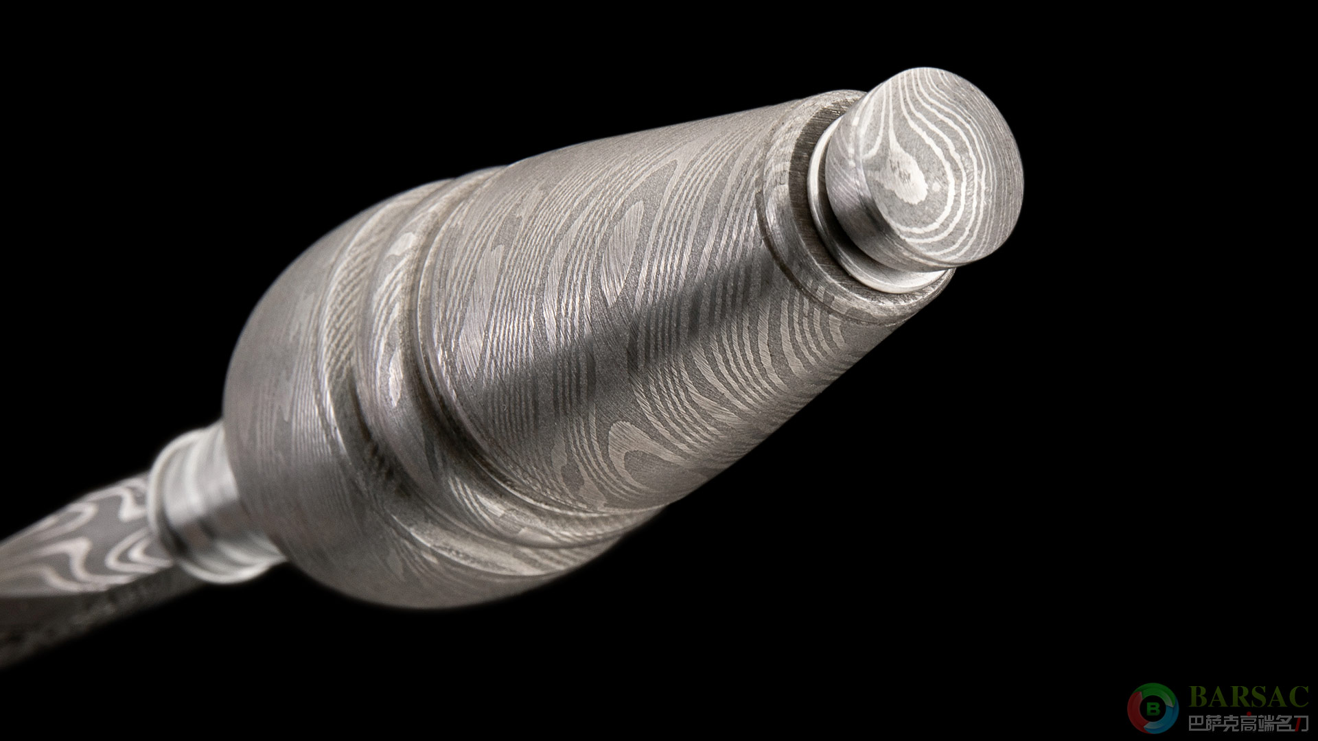 这件作品亦是戴安娜全新的钢铁艺术创作,个性十足。整件作品除了刀颈以外,全部采用大马士革制作而成,花纹连贯动感,用料相当扎实。其独特的外形不模仿任何艺术刀形制,垂直欣赏整体如同放在地上的小烟花被点燃之后,往上喷出花火,让人过目难忘。