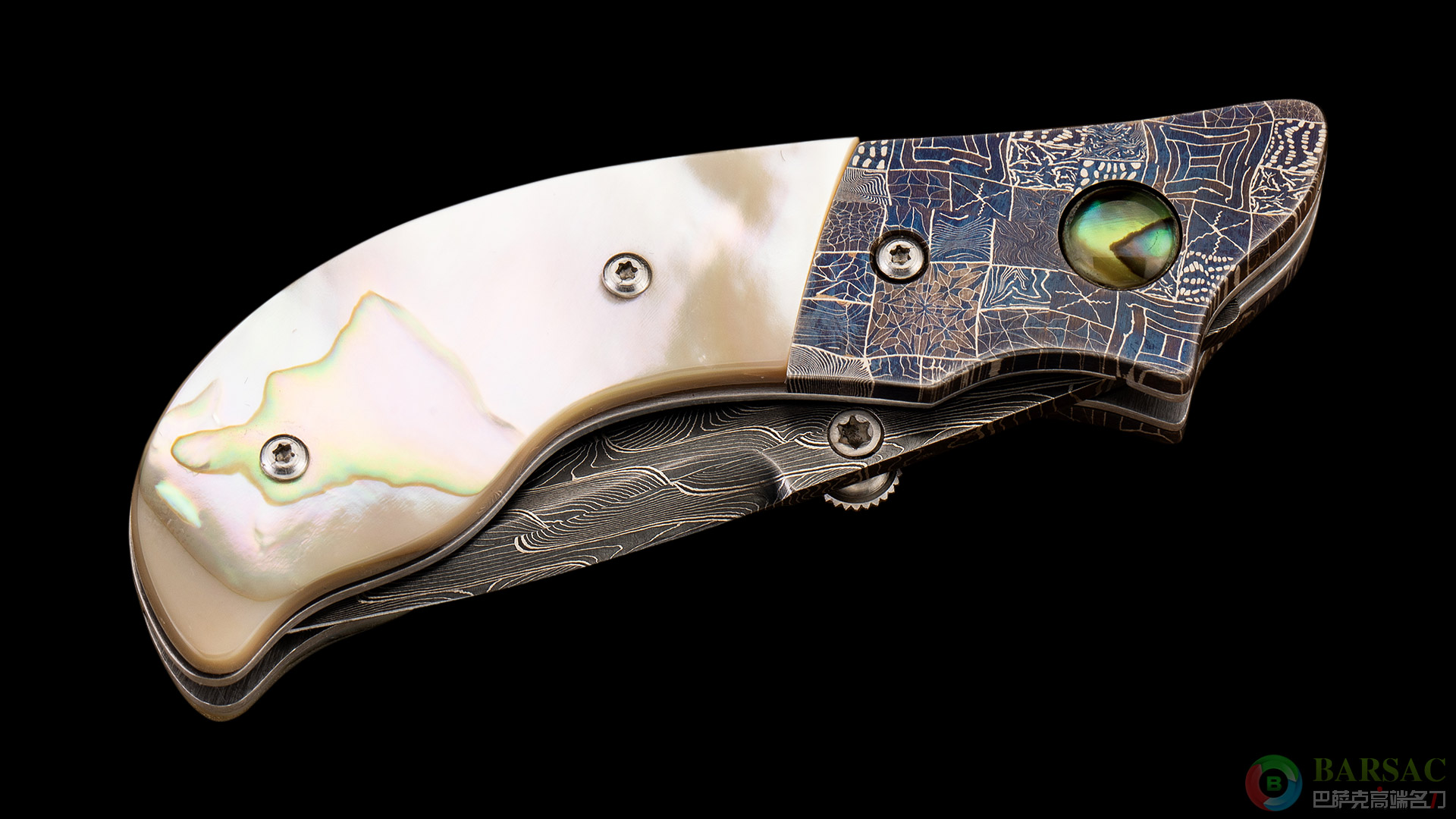 护手中心主轴处镶嵌精美鲍鱼壳,如同漂浮在宇宙中的一颗绿色星球,当刀刃慢慢转动之后,推钮自然而然形成了如同卫星一样的旋转轨迹,浪漫至极。刀柄采用鲍鱼壳制作,再次强化梦一般的美妙光景。整件作品精巧雅致,是非常出色的绅士折刀。