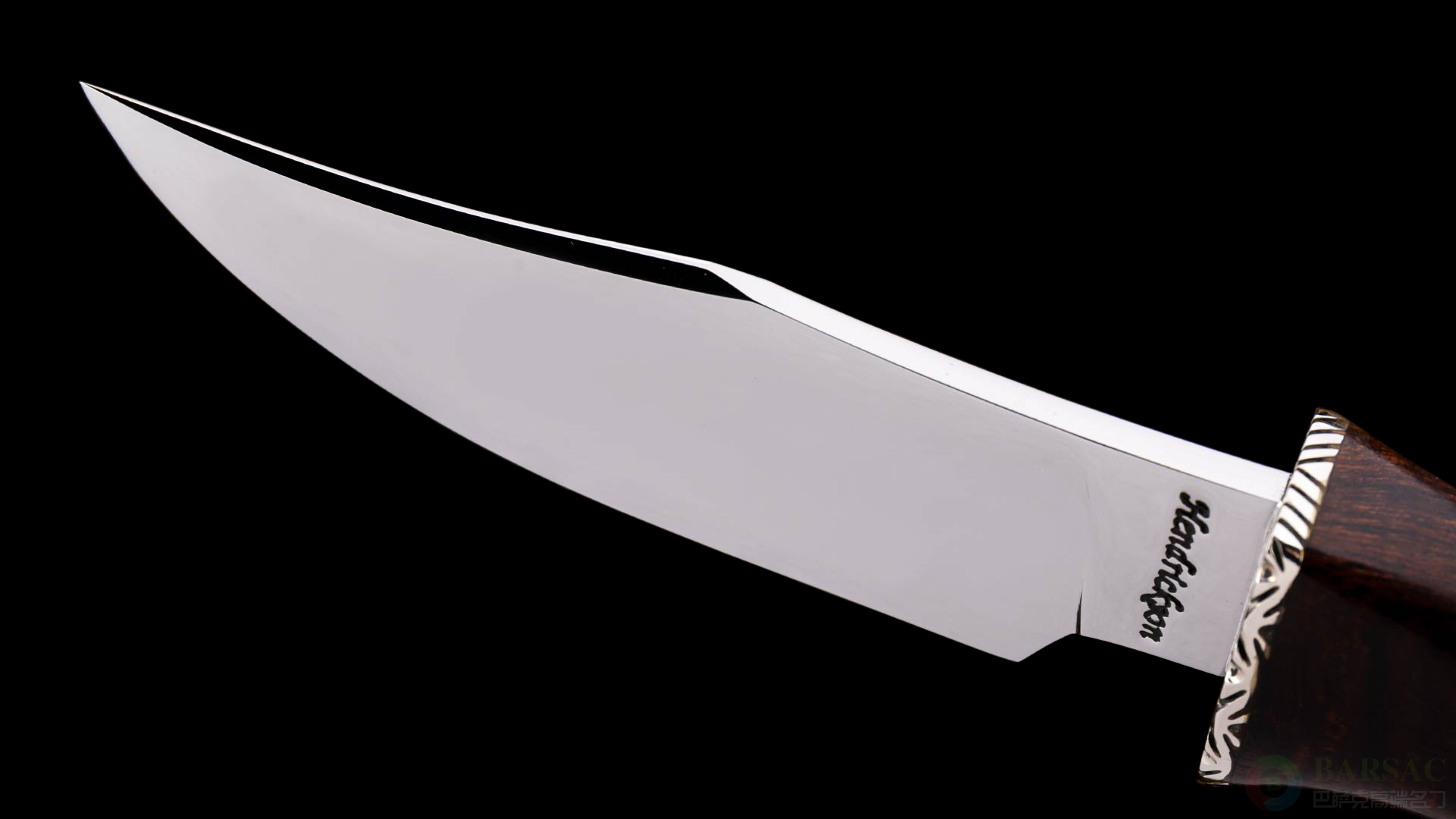 老亨这把精美的猎刀全长23.5厘米,采用高碳钢打造而成,精美镜面抛光处理,光彩照人。手柄采用美洲花梨木,鹿角、沙漠铁木组合而成,并用银丝掐丝,镶嵌松石制作出优美图案,带有强烈的美式原住民风格。