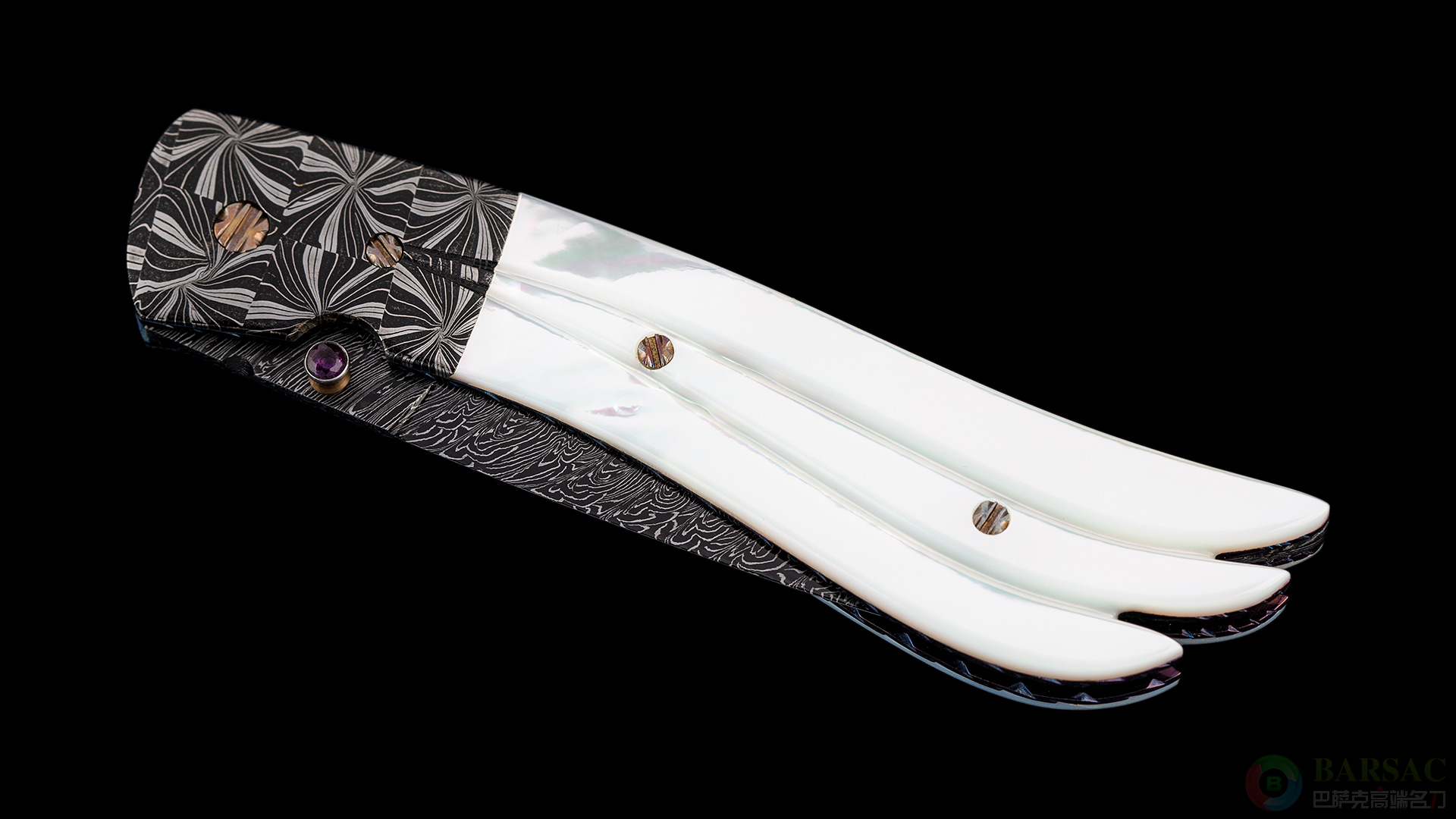 珍珠贝母刀柄,简约雕刻如同鸟羽,动感形象。刀柄侧面带有精美锉花,内外双修,加上烤蓝衬片加持,细节琳琅满目。整件作品的螺丝都是巴瑞手工打造,非市面贩售零件。此件作品材料华丽,外形简练,是让人心动的精美折刀。