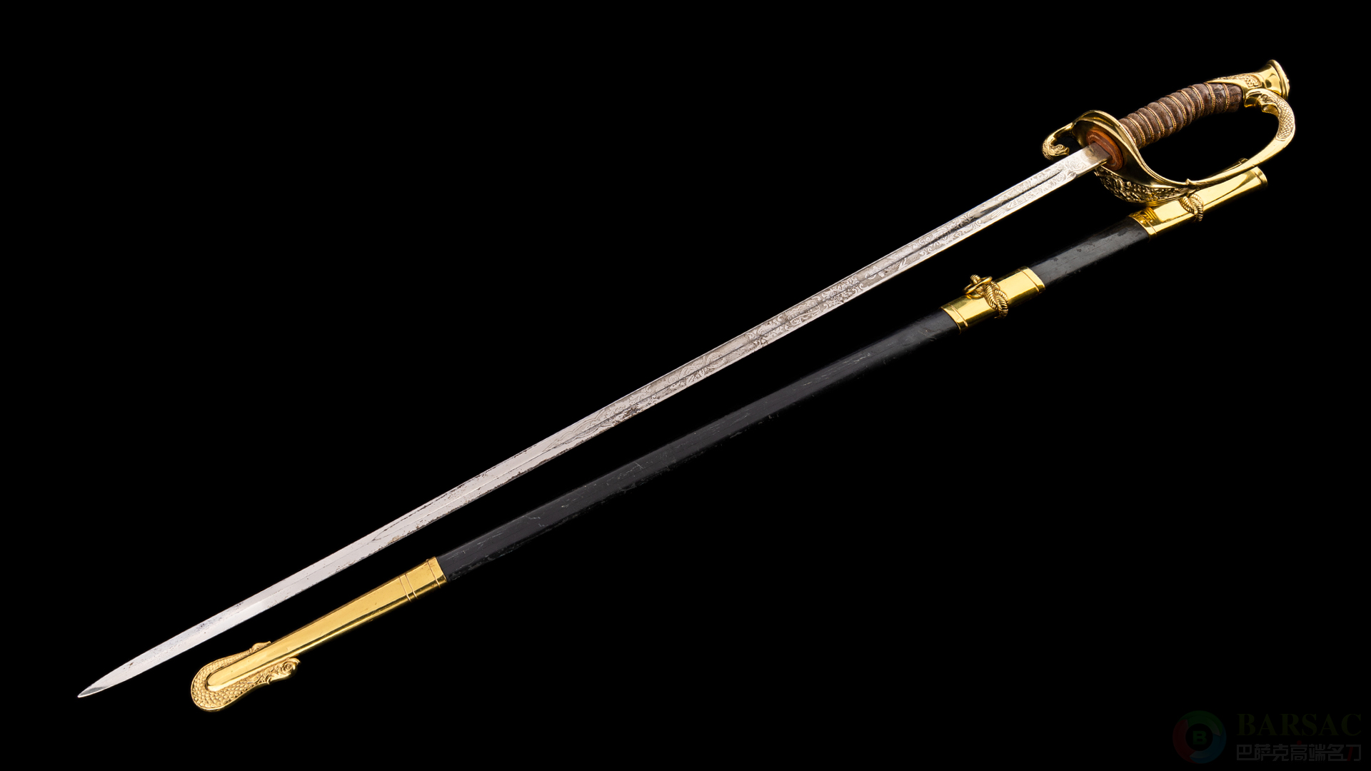 极为少见的高配款式,19世纪印度刀匠手工打造。全长41.5厘米,刃长27.5厘米,重430克。刀刃由高碳钢打造,刀刃装饰极其华丽,依靠手工雕刻塑造出精美的凹槽,浮雕区域采用鋄金工艺依靠黄金打造优美卷叶花卉以及伊斯兰经文修饰。