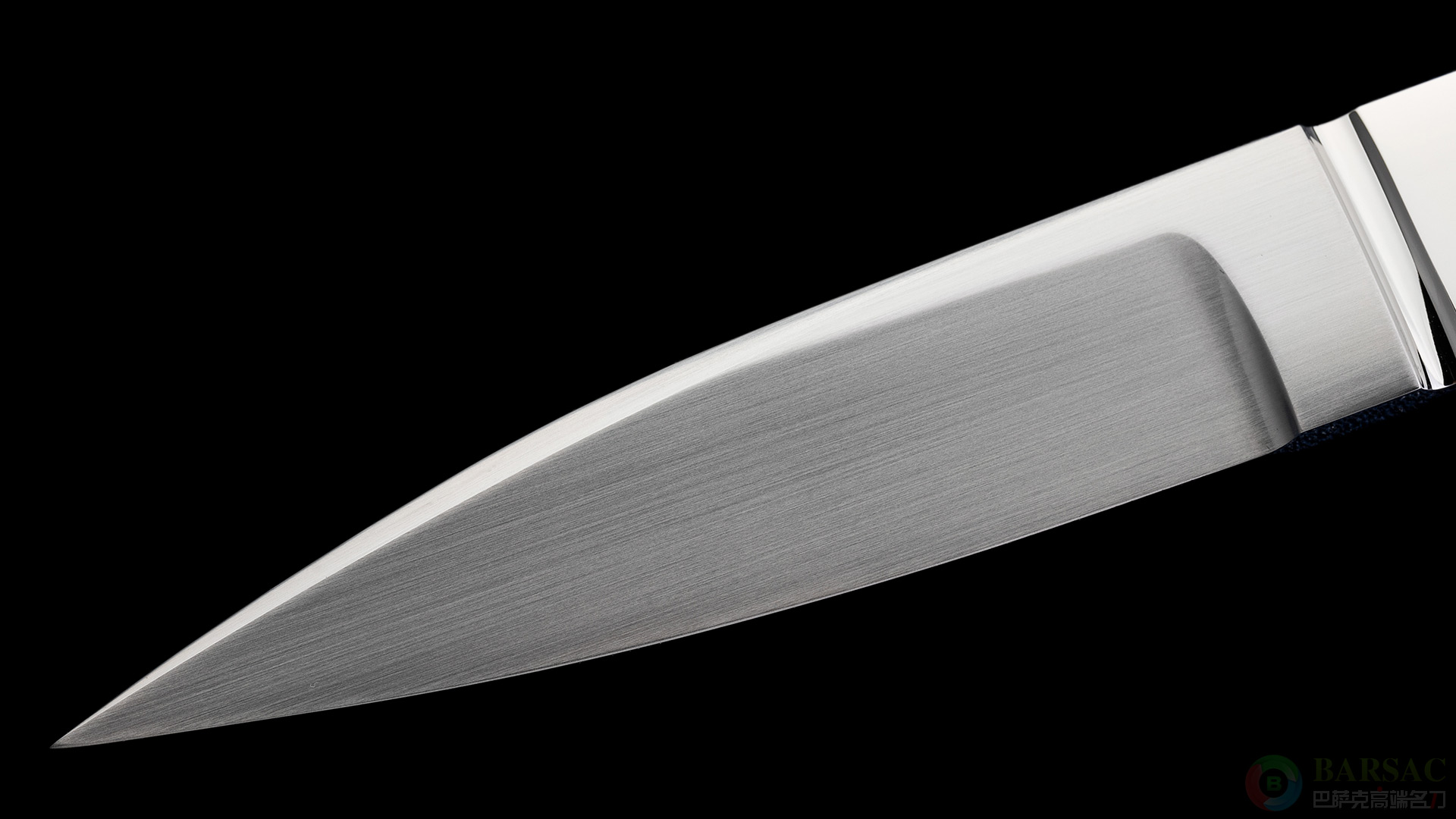 这款多瑙河作品刀身采用440C一体钢全手工研磨成型,手工缎面拉丝处理,处理非常精湛。刀柄则采用镜面抛光处理,刀柄中心镶嵌了瑞典粉末大马士革并处以镜面抛光处理,整体色彩光洁照人且富有变化,让人回味无穷。沃氏风格是极致的去装饰设定,装饰本身与线条融为一体,让人爱不释手。