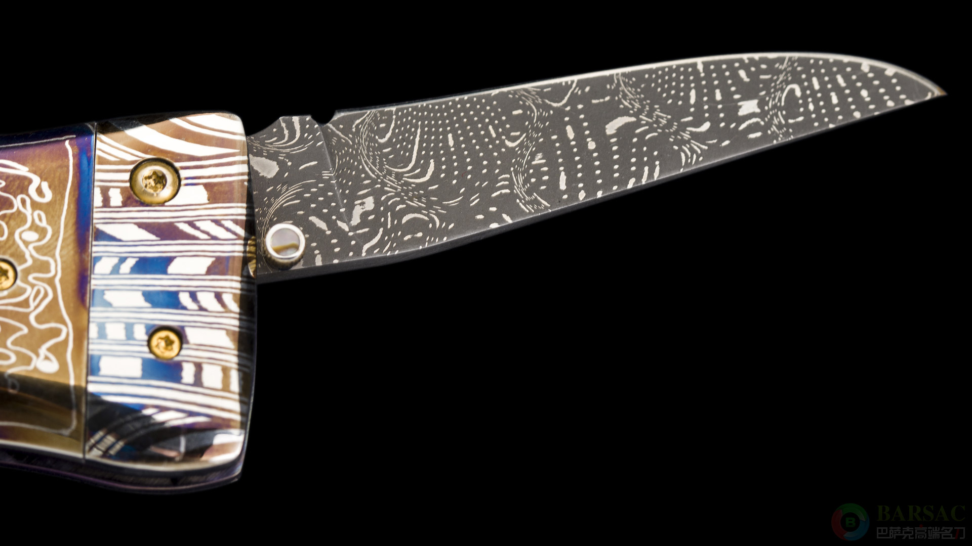 豪华个性、活泼生动的全大马士革双刃折刀,非常罕见!美国刀匠协会老牌名匠罗纳德·江森手工制作,孤品唯一。罗纳德1972年开始做刀,现年已经77岁,仍然活力充沛,制作各种刀剑的同时也活跃于各大展会。罗纳德最擅长制作精美的折刀作品,其作品时常刊登在国外杂志上。