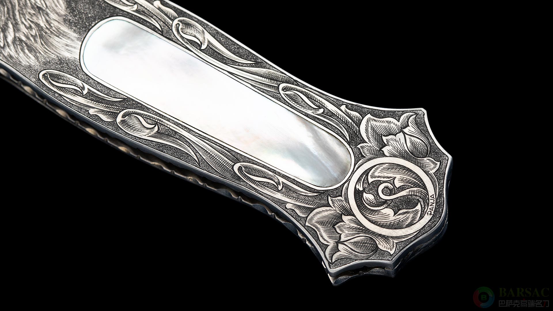 刀柄侧面带有不锈钢背花以及衬花装饰,采用线锁设计,精巧耐用。此件作品外观简约大气,雕刻品质出众,让人感受到珠宝版的品质。