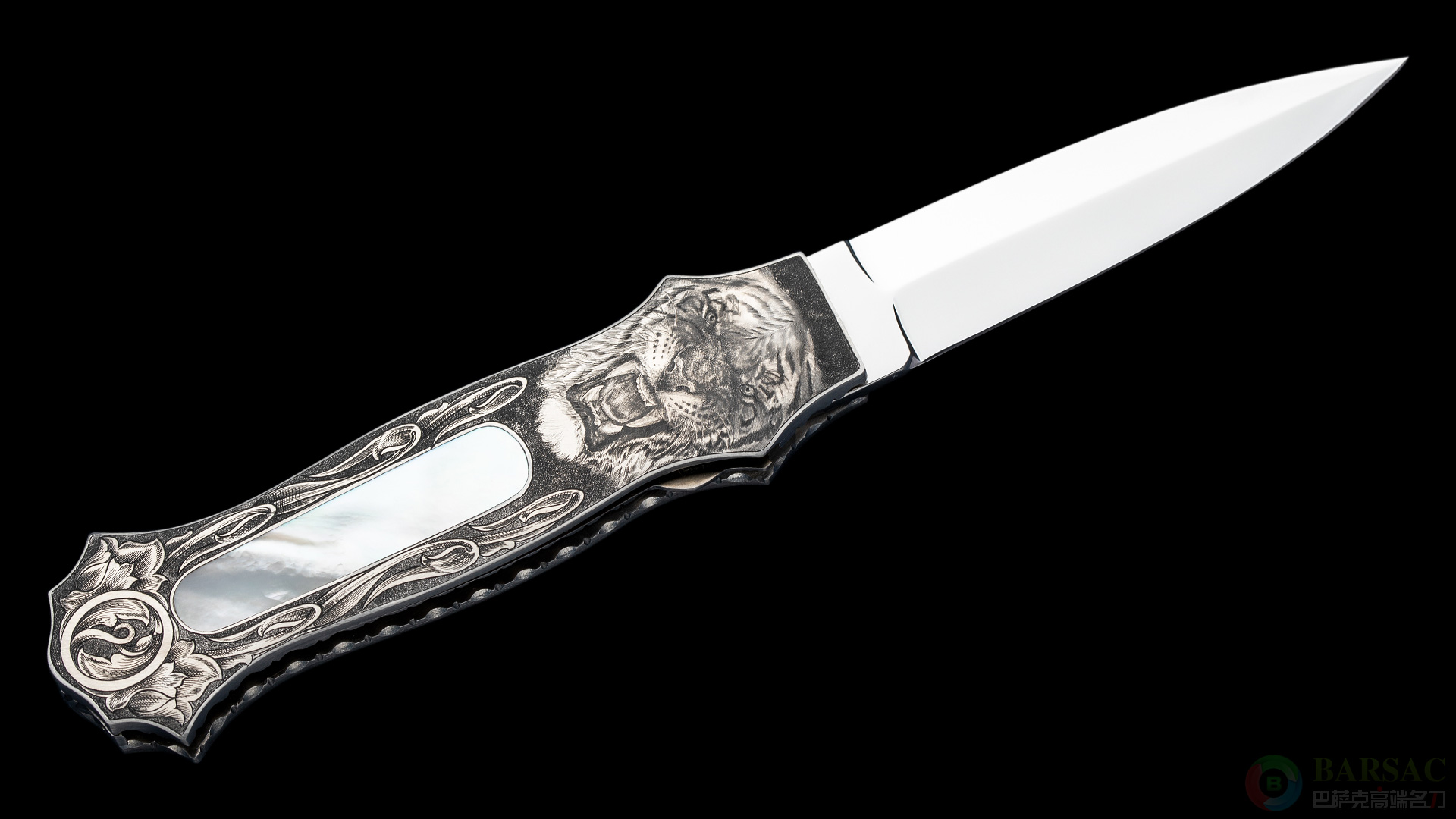 这把兽王争霸作品刀刃采用不锈钢制作而成,抛光细腻,光洁闪耀。刀柄采用不锈钢制作而成,中部镶嵌珍珠贝母,光洁亮丽。刀柄展现了潘贾出色的雕刻技艺,采用了影雕技法刻画了狮子与猛虎的头像,图案威猛生动,细腻出彩,图案四周还伴随着精美的卷叶图案装饰。
