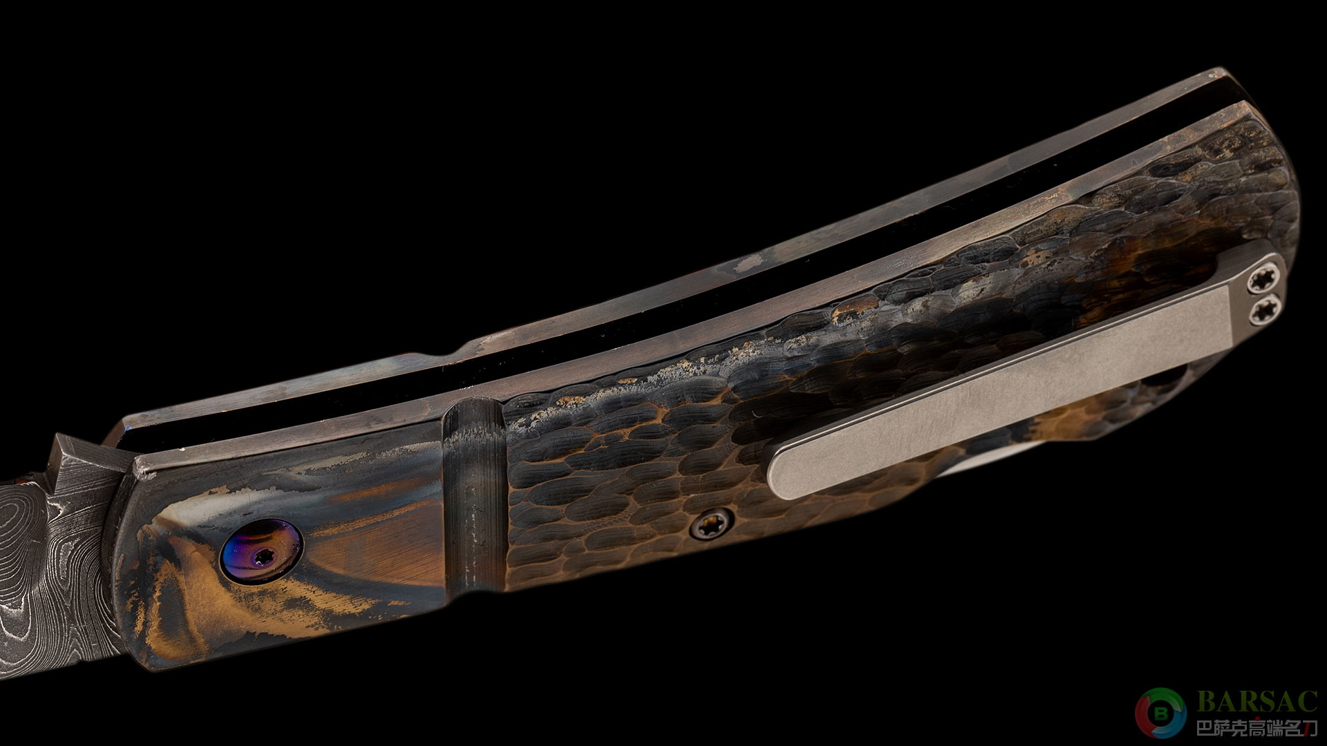 美国ABS刀匠协会MS大师麦克·瓦尼诺手工打造,孤品唯一。麦克1995年开始做刀,2001年获得JS,2003年获得MS,2011至2015年一直担任ABS董事会成员。麦克的技法很全面,他不仅擅长锻造大马士革制作ABS体系的直刀,同时他也是ABS中少有的擅长制作折刀的名家,此件作品可见一斑。