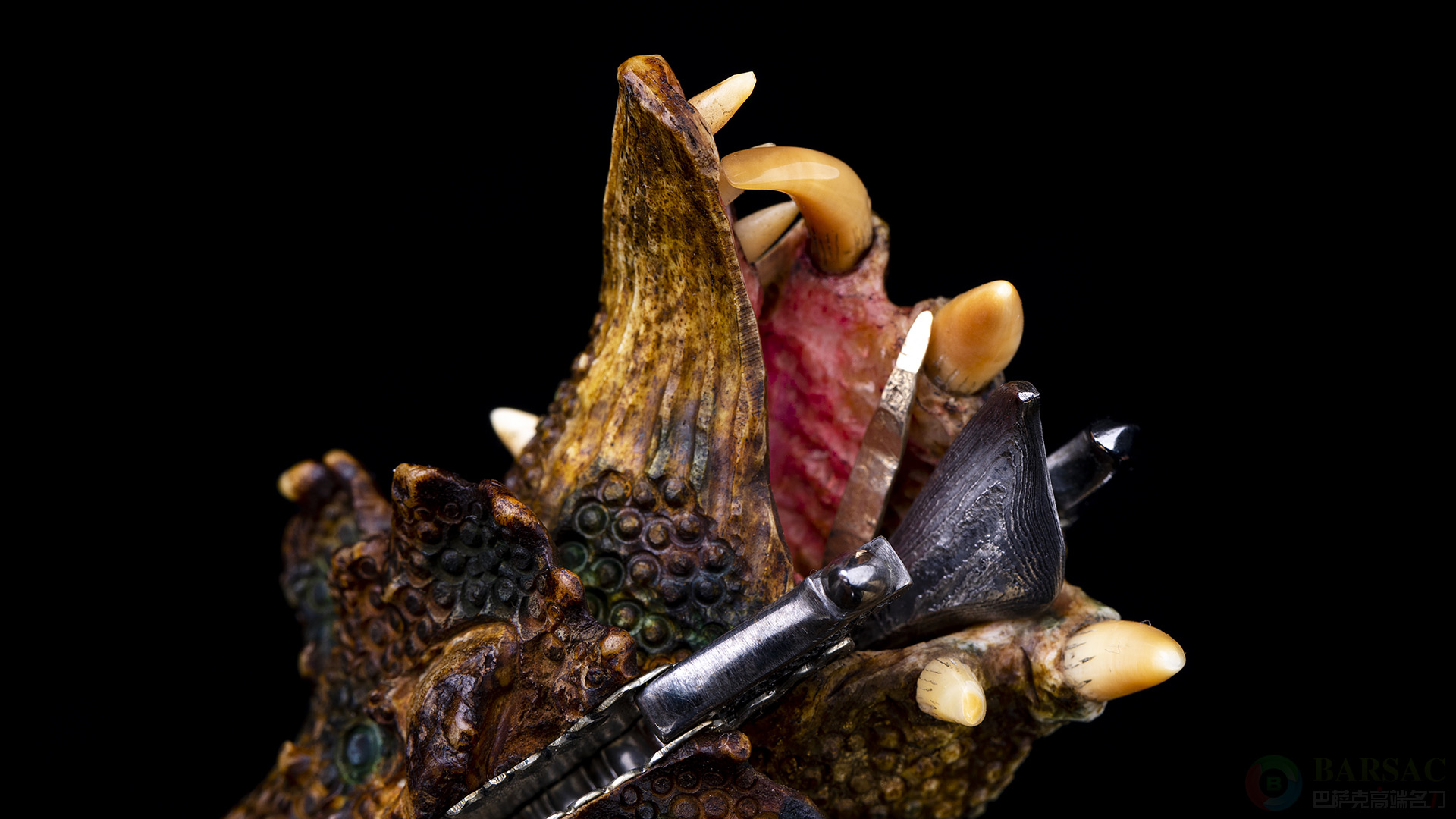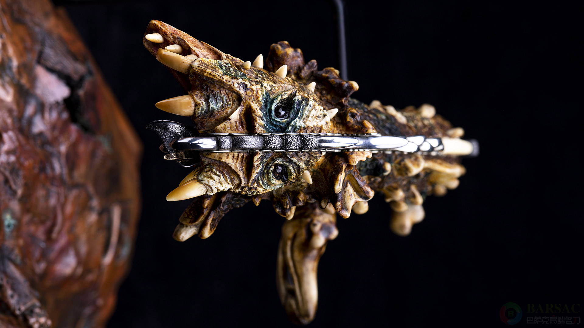 这款赞娜魔兽作品全长26.5厘米左右,刀刃采用拉瑞锻造大马士革钢制成,花纹如同泛起波光的流水,动感而透彻。刀刃末端精心雕刻出犹如卷叶一样的高浮雕,当刀刃收则至九十度时,呈现出优美的线条与格调。刀柄选用鹿角角冠,花费大量的心血雕刻而成。赞娜魔兽身体四周伴随着众多大小不一的犄角,造型各异,展现出庞大的雕刻工作量。赞娜背鳍处配置有猛犸牙与不锈钢雕刻而成的鬃毛以及犄角,一气呵成地展露出魔兽霸气的轮廓。海象牙化石制成的獠牙,红宝石制成的双眼,以及黄金与大马士革雕刻的长舌,脸部的每一个细节再次展现出大师功力非同一般。
