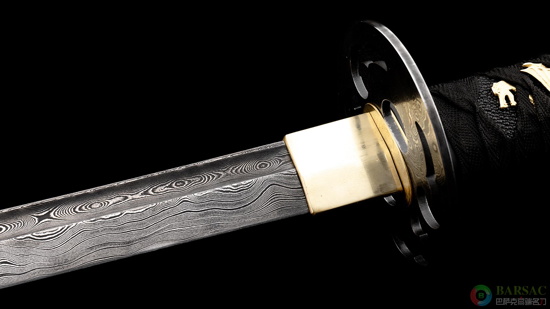刀刃用维内多锻造大马士革制作而成,花纹细腻连贯,质感出众;带有通体刀槽,视觉效果更加锐利。刀镡采用维内多锻造大马士革制作而成,做了漂亮的图案镂空。刀柄采用日本传统工艺制作,包裹珍珠鱼皮,镀金飞龙目贯装饰。带有原装漆木刀鞘。整刀霸气威武,做工精美,手感出色,让人爱不释手。
