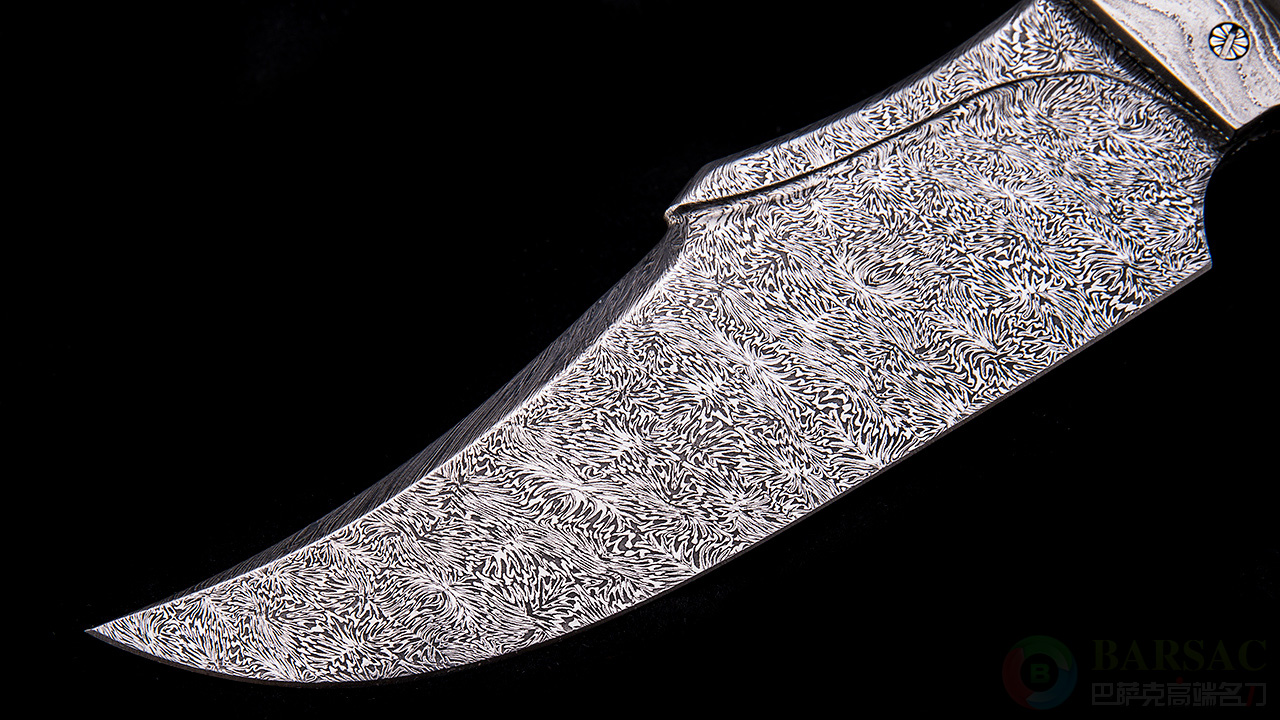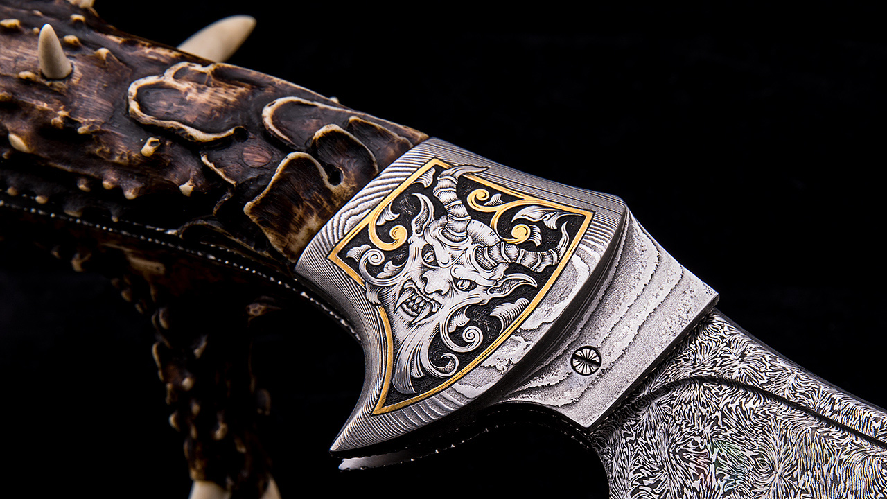 这是一只非常庞大的怪兽,外观上延续了哥布林一贯的妖邪魔幻风格。刀刃采用汤姆锻造大马士革制成,花纹非常细密,并伴随美妙的雪花纹理。刀刃末端雕刻哥特风格月亮神像,同时兼顾开刀拨钮的功能。护手采用大马士革制成,表面精湛的雕刻出恶魔的头像,愤怒与嘲讽的神态刻画得入木三分,并采用黄金镶嵌勾勒边缘。