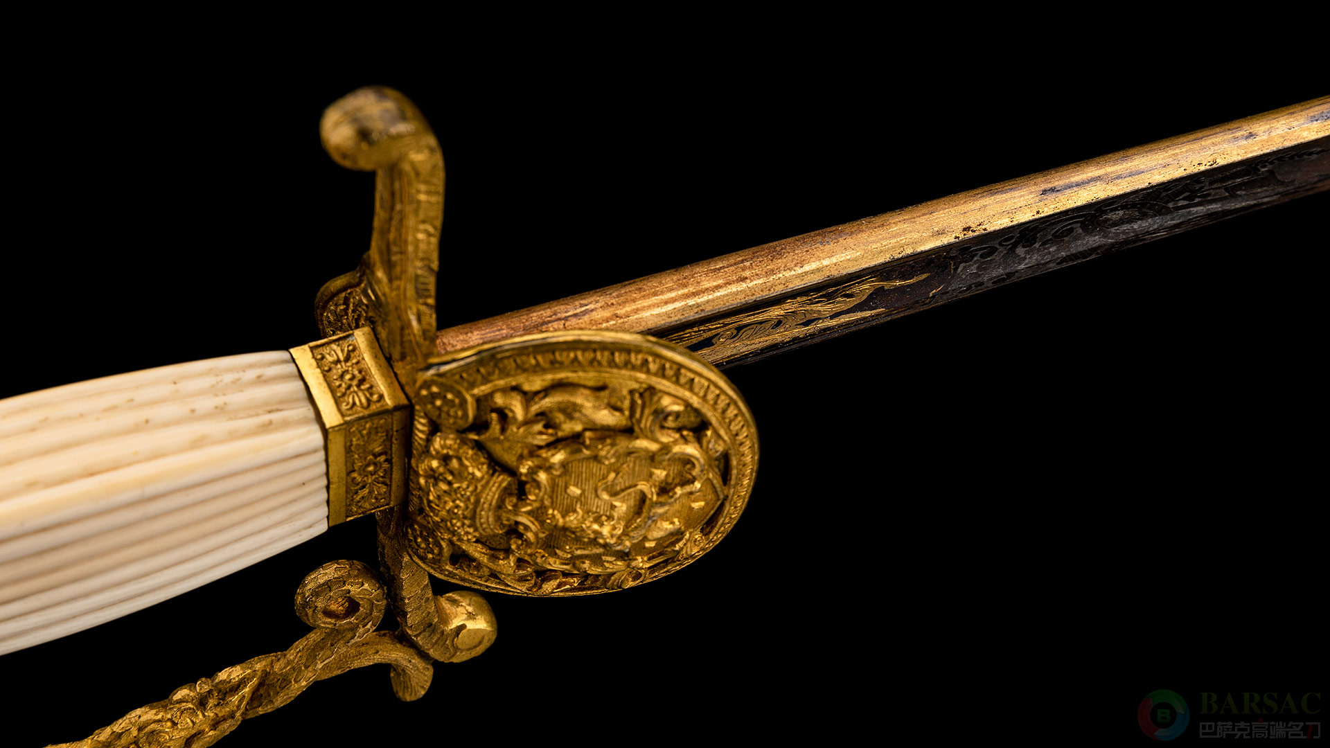 等级很高,做工精美,19世纪前期德国索林根出品,为比利时高级文务官员所佩戴。全长91.5厘米,刃长78厘米,裸重513克,鞘重100克。剑身笔直修长,精美烤蓝工艺镀金装饰的优美花卉与奖杯图案近乎覆盖整个剑刃,图案细腻优美。剑柄为黄铜镀金制成,带有贝壳式护手设计,表面带有狮子国徽浮雕,非常大气。
