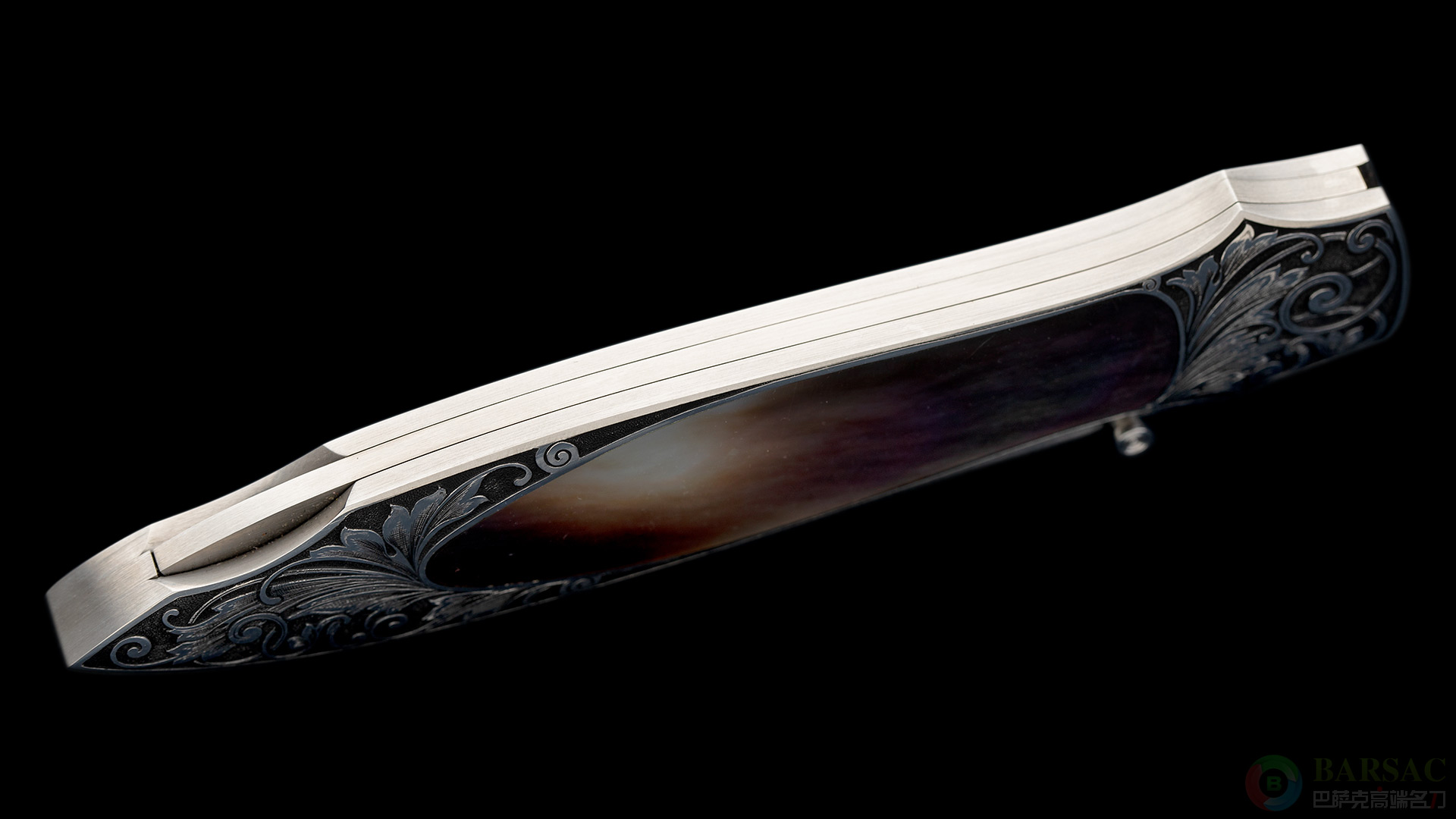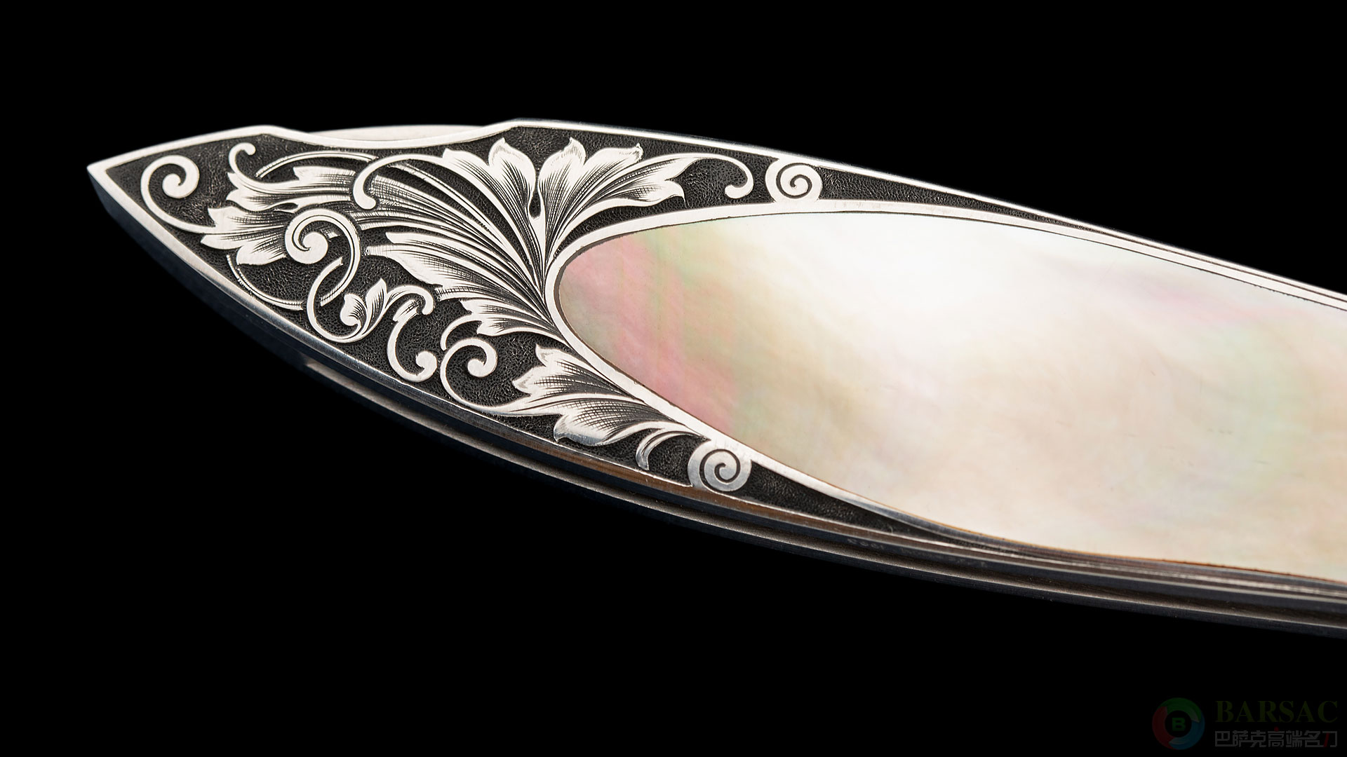 刀柄两侧由美国著名女性雕刻师丽莎·托姆林操刀,雕刻了非常精湛的卷叶图案,图案潇洒飘逸,与贝母的色彩共同构建了一幅奇幻的湖泊景致。采用背锁设计,坚固耐用。整件作品是非常精致的绅士美折,让人爱不释手。