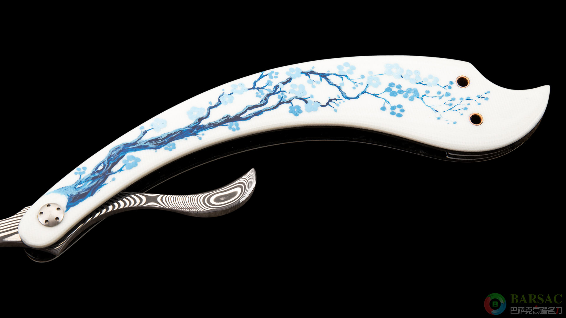 398 是一款限量版剃刀,由两名艺术家联名制作。该剃刀采用了新的平行图案大马士革钢,全空磨7/8直刀刃设计,确保了剃须的精确和舒适。刀柄由白色G10材质制成,尤尔手工绘制了樱花图案。此款剃刀还配有一个立体的立方体画作,上面绘有相同的樱花设计,形成一个独一无二的限量版套装,提升了整体的艺术性和收藏价值。