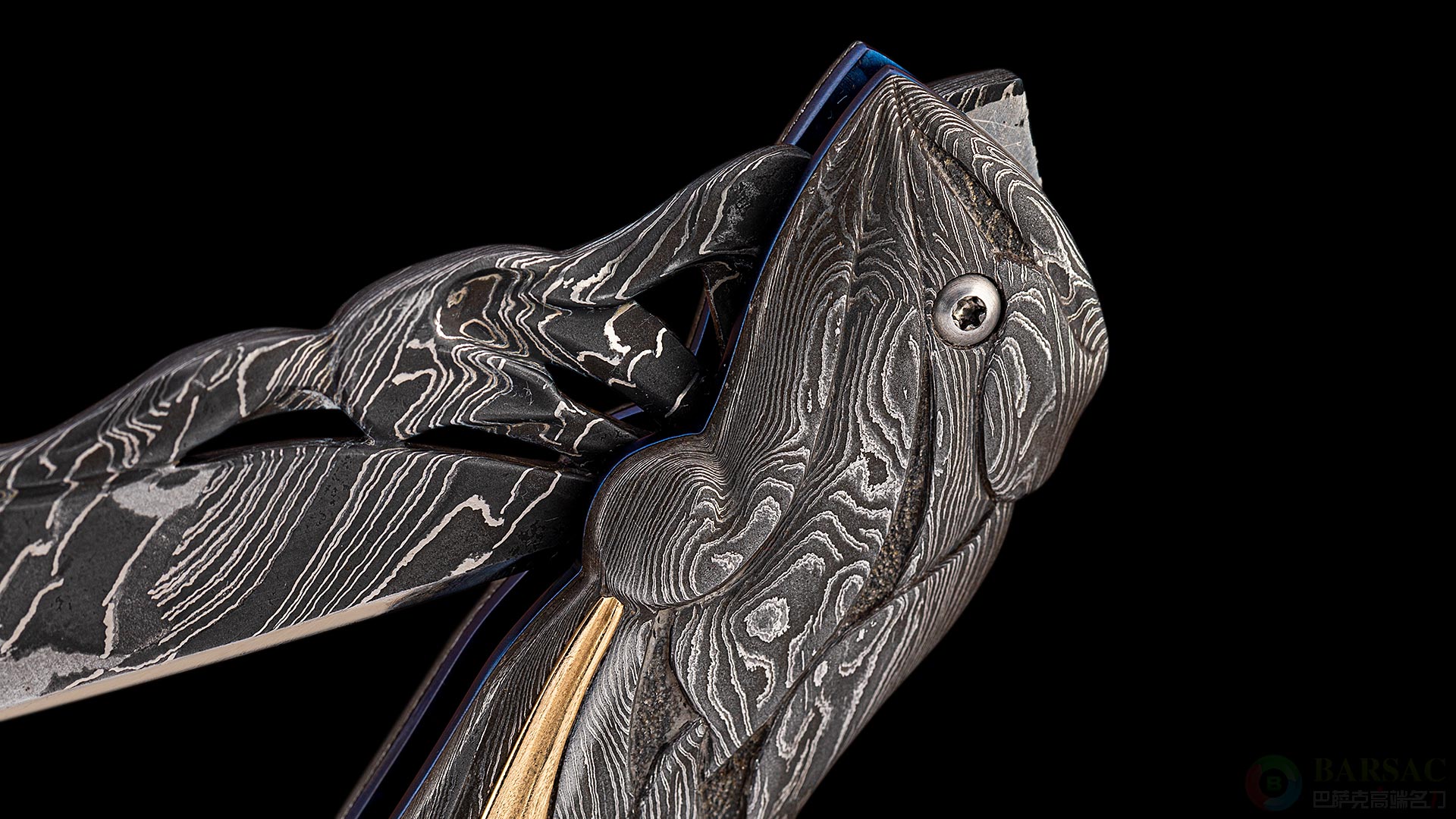 加拿大刀匠协会名匠唐纳德·贝尔手工打造,孤品唯一。唐纳德做刀数十年,擅长制作艺术类折刀。他的作品往往带有出色的浮雕镂空雕刻,给人雕塑相似的美感。