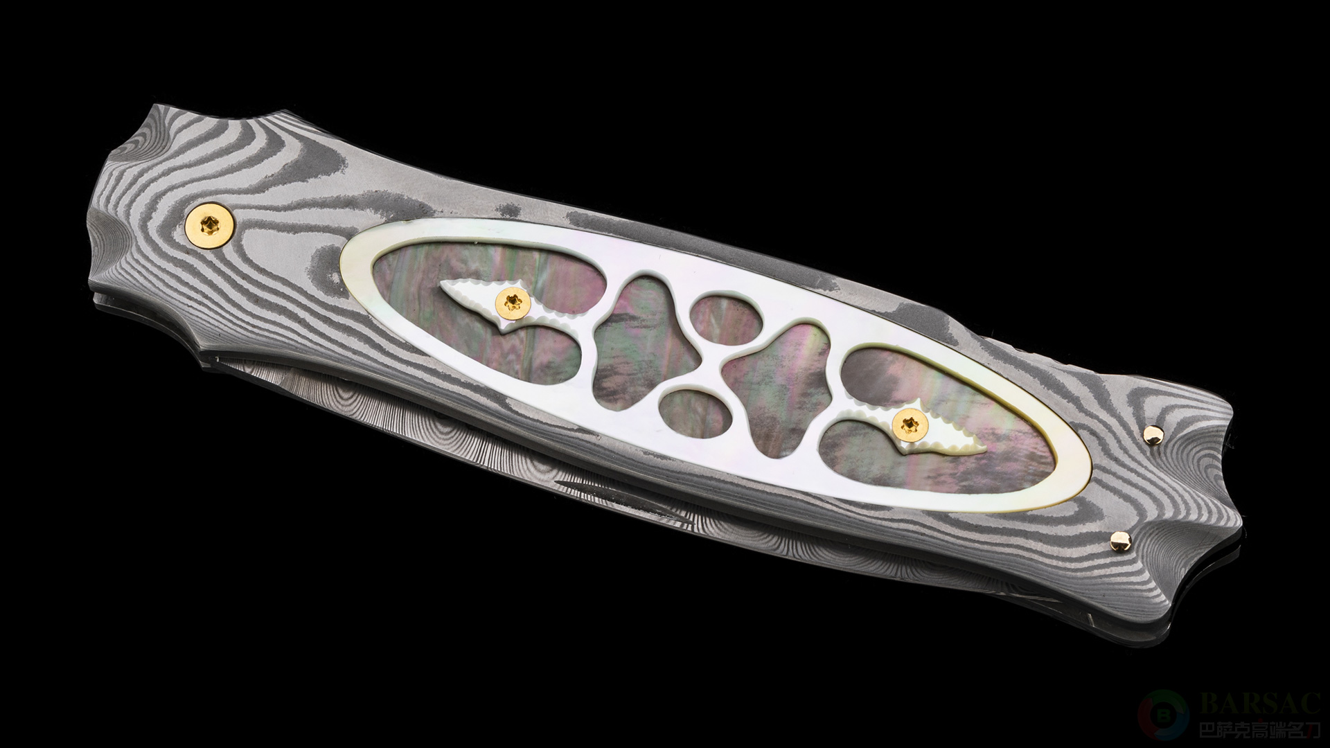 比尔这款夜想曲作品刀刃为大马士革钢制作,花纹动感连贯。大马士革刀柄花纹粗犷写意,与刀刃花纹形成强烈对比。刀柄中部开窗,底部镶嵌深海黑贝母,外侧镶嵌镂空雕刻的珍珠贝母。