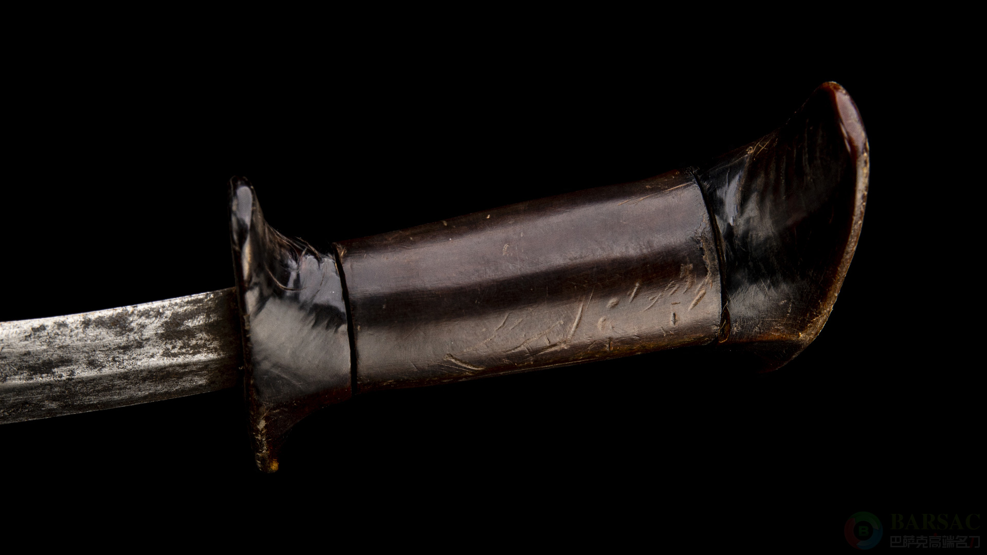 这件作品为19世纪埃塞俄比亚刀匠手工打造,全长78厘米,刃长66厘米,裸重765克。钩状且宽大的刀刃由碳钢打造,像是疣猪的獠牙一般,极具魄力。刀柄采用高级材料制作而成,柄尾带有银制尾铁,这种等级的肖特尔一般都是配给军官或者权贵阶层。就年份而言,品相优秀,是非洲古兵器收藏的佳作。