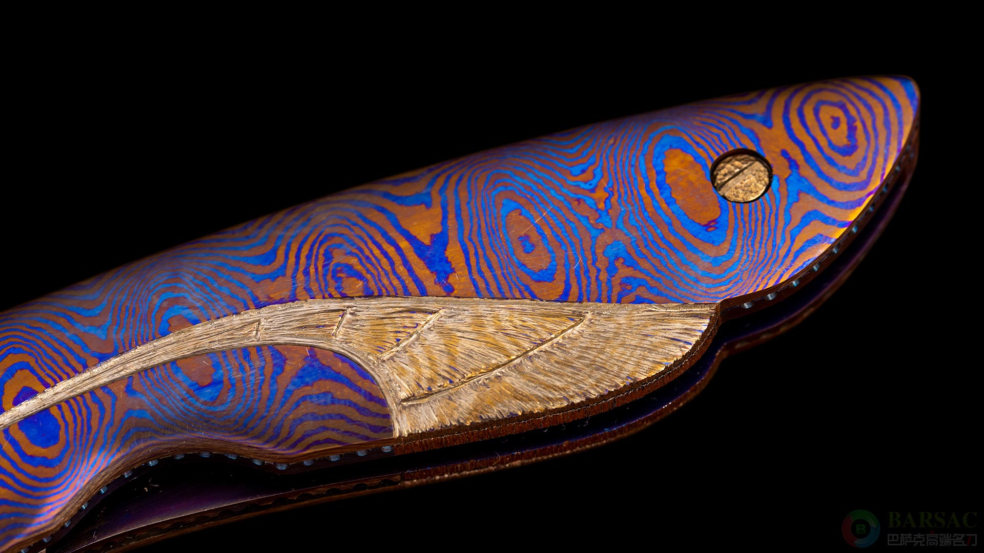 这款萤火虫作品刀刃为汤姆锻造大马士革钢制成,花纹极为细腻,彰显出MS等级的锻造实力。刀柄为汤姆发明的钛马士革,这种材料现在得到广泛运用以及认可,在创始人手中更是得到了充分的发挥,绚丽的色彩加上粗犷的肌理雕刻,给人昆虫的意象之美,抽象含蓄。