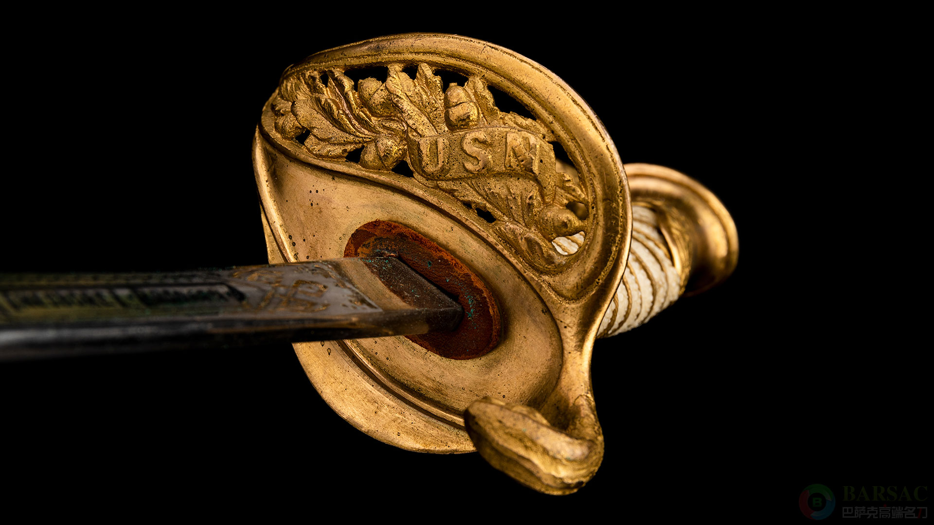 剑柄采用黄铜镀金处理,护腕镂空,带有卷叶浮雕,非常精美。握把为木胆外表包裹珍珠鱼皮并缠绕铜丝装饰,柄尾带有五角星以及海雕的浮雕。原配剑鞘,整件作品保存完好,部件齐全,昔日精英之剑,收藏极具意义。