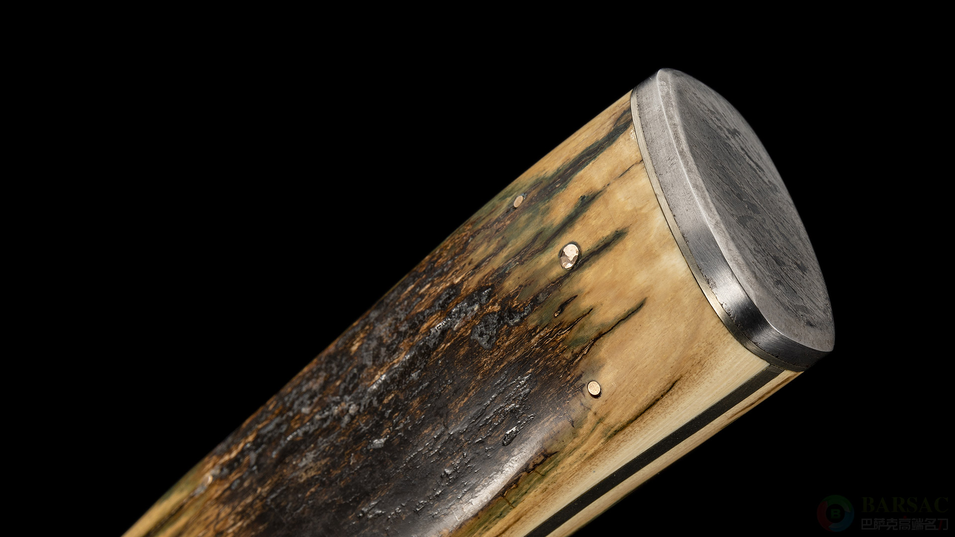 这件泰坦博伊全长44.5厘米,刃长31厘米,裸重772克。刀刃采用史蒂夫锻造大马士革钢制成,非常漂亮的雪花纹紧密排列,一般辨识出自名家之手。S形护手采用古碳钢回炉锻造而成,粗犷古朴,耐人寻味。
