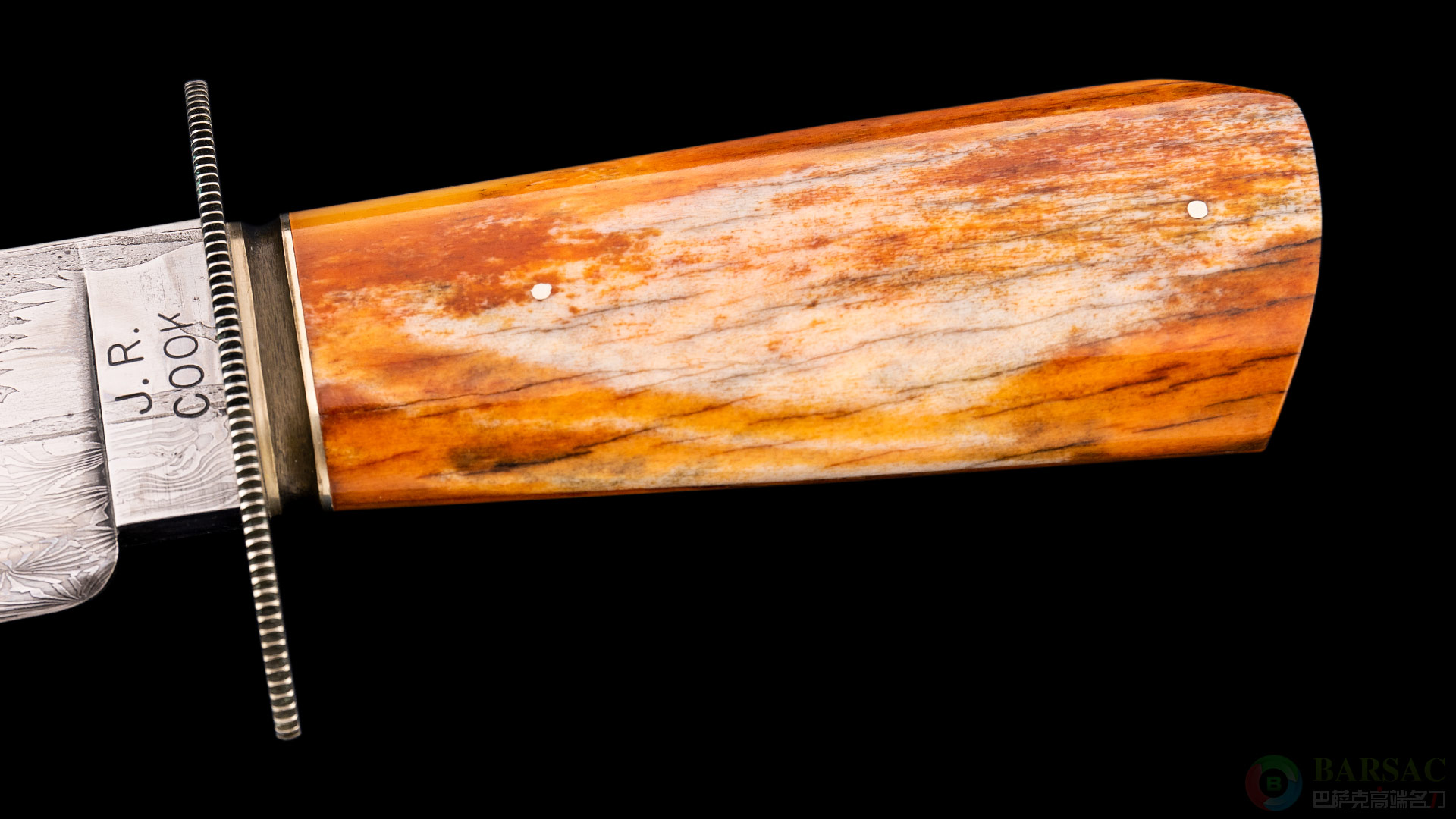 护手为传统椭圆形制,边缘带有精美锉花,外观粗犷细节精湛。手柄采用精品猛犸牙化石制成,握感柔滑细腻,詹姆斯作品近年来一直是国内收藏的热门,如此精品更是ABS爱好者的不二之选。