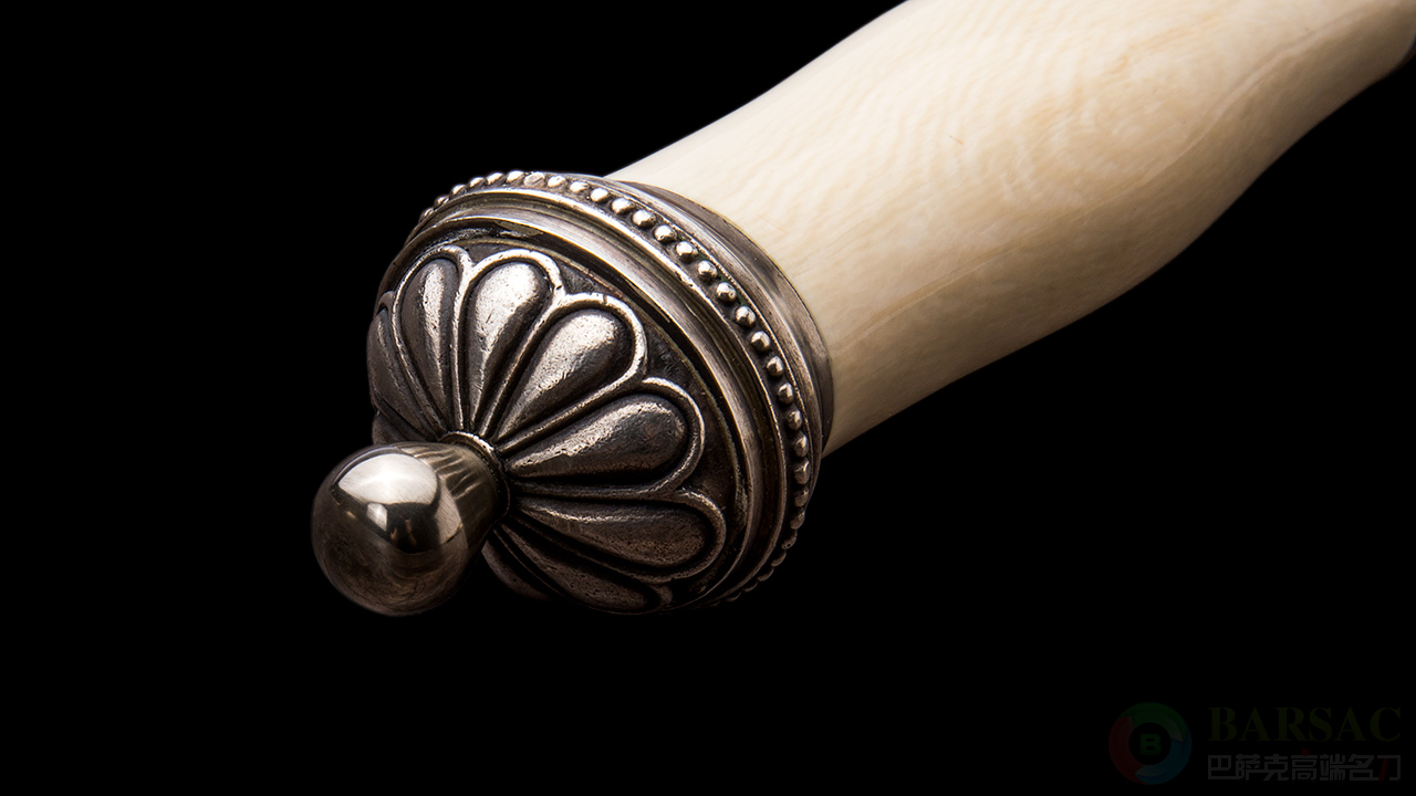 手柄选用优质猛犸牙化石制成,质地柔滑细腻,皇冠型的尾帽更显大气。刀鞘由镊银打造,抛光精美,绒布内胆,可有效防止刀刃摩擦损耗。高端男士文案精品,把玩收藏重器,奢华的皇室风采珍品触手可及。