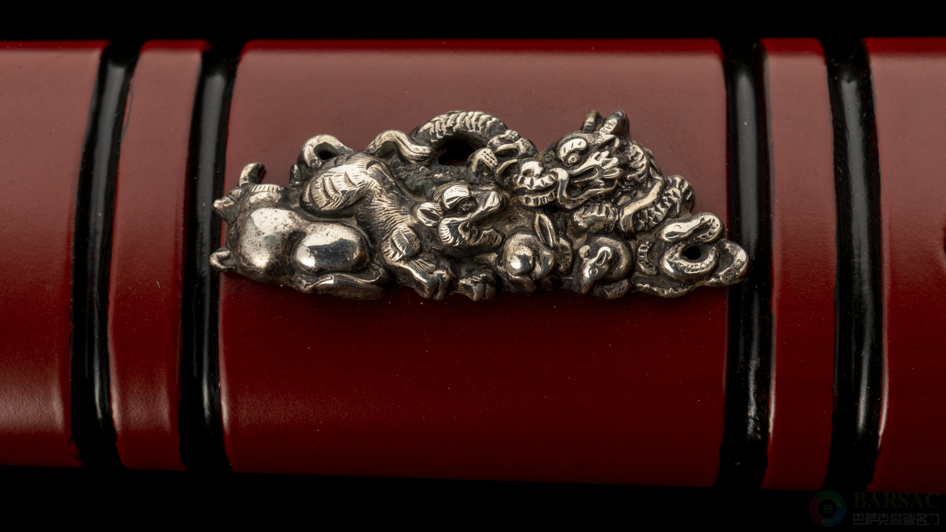 这款十二生肖胁差刀刃为唐锻造夹钢并烧刃处理,性能出众,表面的烧刃纹清晰流畅。手柄装具为纯银制作,目贯雕刻了十二生肖的造型,造型生动,柄尾则是牧童骑在牛背上吹笛子的造型。漆木刀鞘收纳,美式日刀精品之作,收藏展示把玩都别有一番回味。