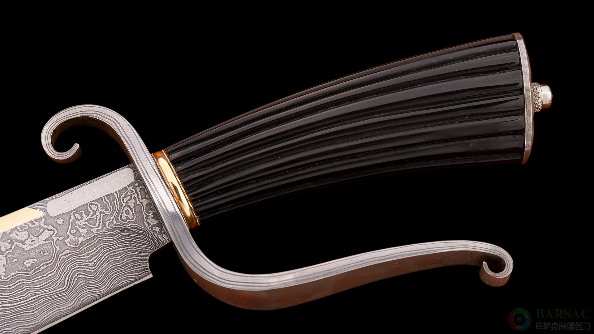护手非常大气豪迈,采用低层数大马士革制成。刀颈奢华,采用黄金指环制作而成,如同精美的珠宝。刀柄采用精品乌木雕刻而成,罗马柱体外形设计,古典雅致,握感优秀。