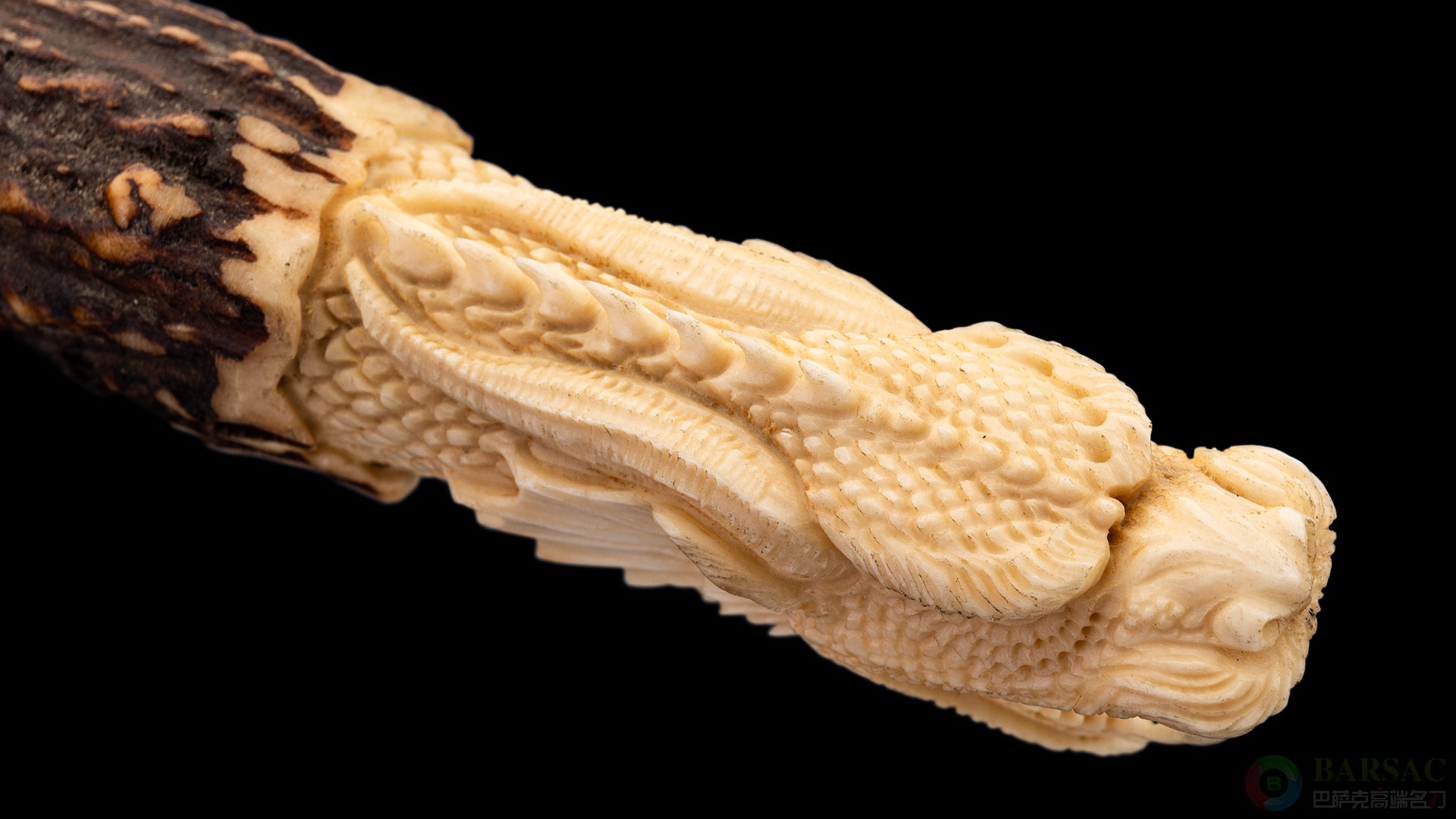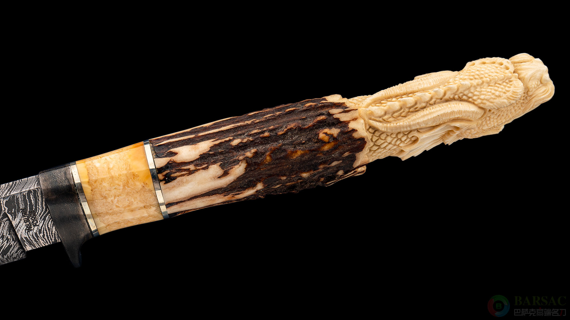 ABS与精美角雕完美结合的艺术佳品,孤品唯一!由美国ABS刀匠协会MS大师亚伦·威尔伯恩手工打造,亚伦2003年开始做刀,2009年取得JS,2013年以状元身份取得MS。艾伦技术全面,曾多次获得北美大型展会最佳大马士革、最佳博伊、最佳猎刀等等大奖。