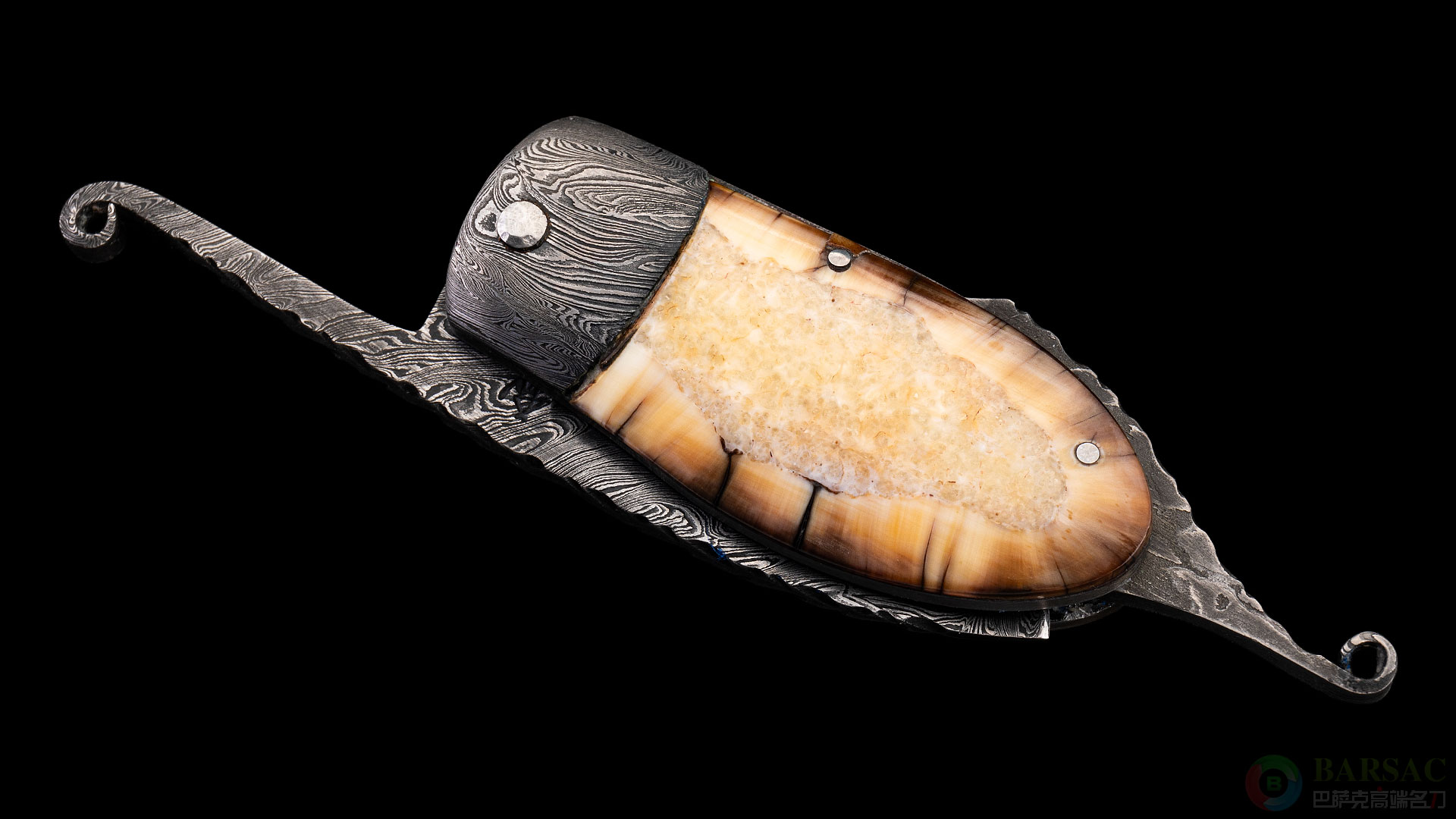 这款印第安之卵为丹尼尔精品颈刀,外形圆润饱满,最原始的摩擦设计方便把玩,使用灵巧称手。刀刃与护手通体采用丹尼尔锻造大马士革制作,花纹连贯有力,彰显出十足的野性之美。手柄镶嵌海象牙化石,以优质的横截面作为原料取材,质地透露出均匀的牙髓质地,极具抽象之美。柄尾带有大气的尾钩设计,加上通体刀背锉花,处处彰显出十足的铁火艺术气息。