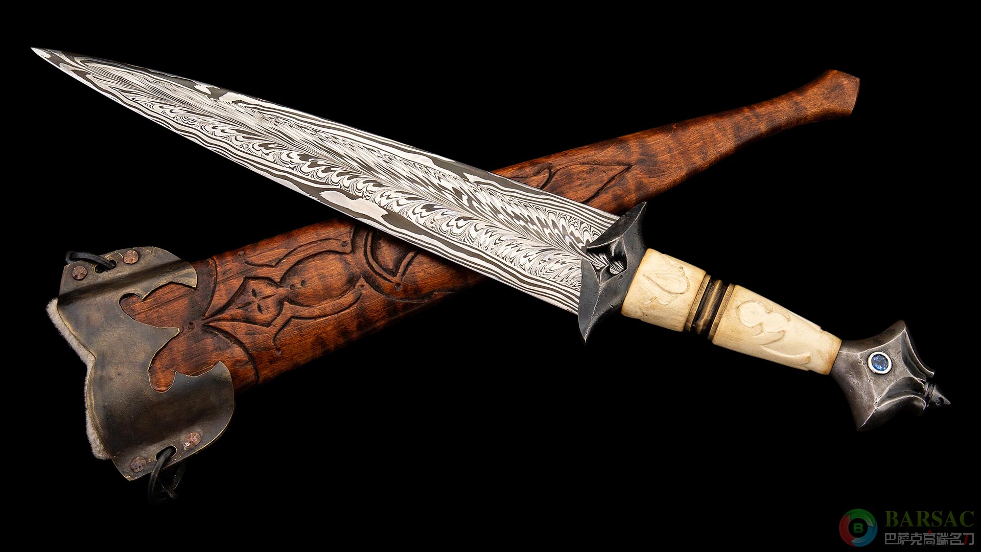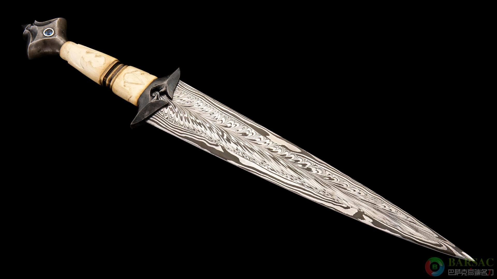 这件日蚀短剑作品就是最好的证明,剑刃采用卡弗锻造伊卡洛斯羽毛纹大马士革制成,剑刃中心潇洒的羽毛纹四周伴随着火焰风暴纹,象征着焚烧着的烈火之羽。护手与尾铁采用低碳钢雕刻而成,表面带有粗犷的石纹肌理,尾铁处镶嵌蓝宝石。