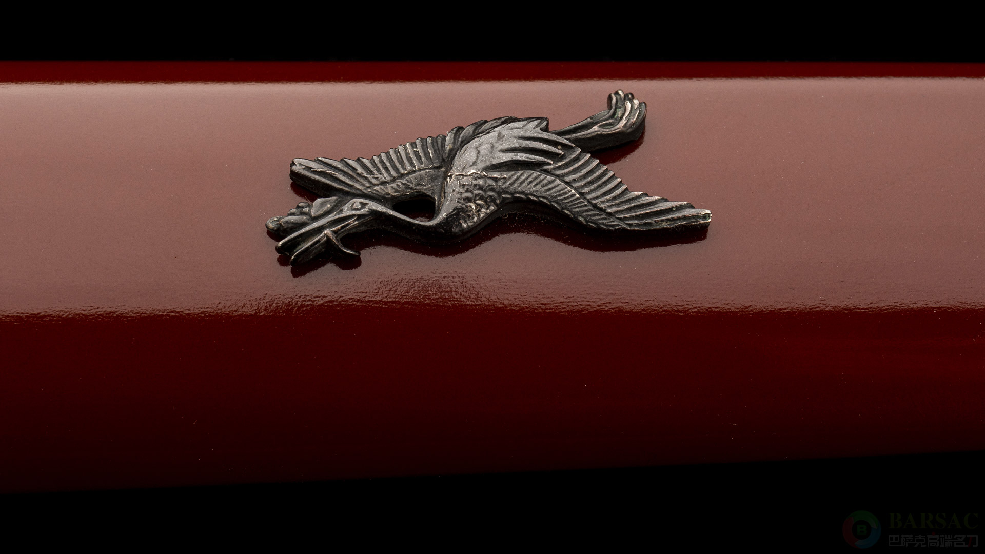 这款鹤刀刃为唐锻造高碳钢夹钢并烧刃处理,性能出众,表面的烧刃纹清晰流畅。装具简约而高雅,采用木柄大漆工艺制作,朱红色泽艳丽而不花哨。刀柄两侧装配有银制成的鹤目贯,非常精美。美式日刀精品之作,收藏展示把玩都别有一番回味。