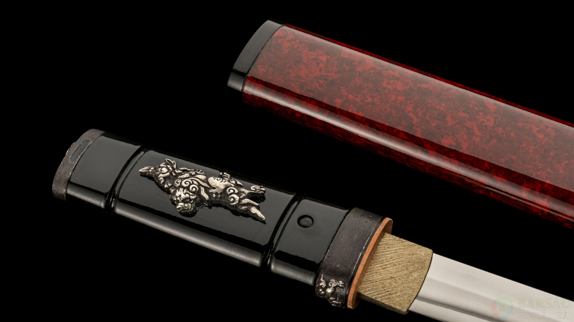 这款瑞兽胁差刀刃为唐锻造夹钢并烧刃处理,性能出众,表面的烧刃纹清晰流畅。配有红黑相间的漆木刀鞘。手柄装具银雕瑞兽图案,细节满满。美式日刀精品之作,收藏展示把玩都别有一番回味。