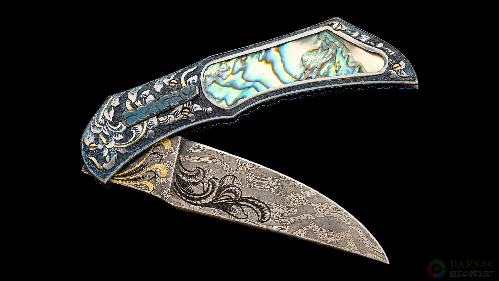 这把美丽的侧跳刀刃由乔迪锻造马赛克大马士革钢制成,纹理独特,富有诗意;刀刃上带有优雅的卷叶雕刻并镶嵌黄金装饰。刀柄采用中碳钢制成,精美烤蓝,色彩古典雅致。刀柄中部镶嵌五彩斑斓的鲍鱼壳,四周制作了优美的卷叶浮雕,并采用黄金装饰。