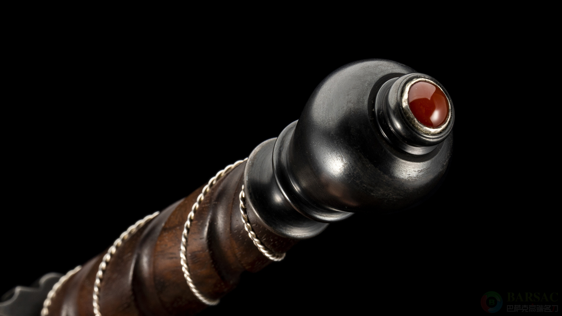 剑柄为美洲胡桃木制成,扭花研磨镶嵌银丝装饰,尾铁也镶嵌了红玉髓作为点缀。整件作品做工精湛同时流露出浓烈的铁火气息,可谓收藏展示佳品。