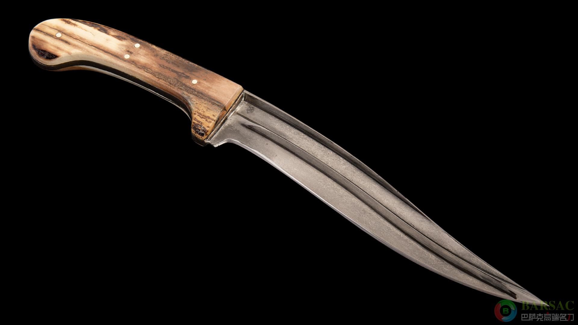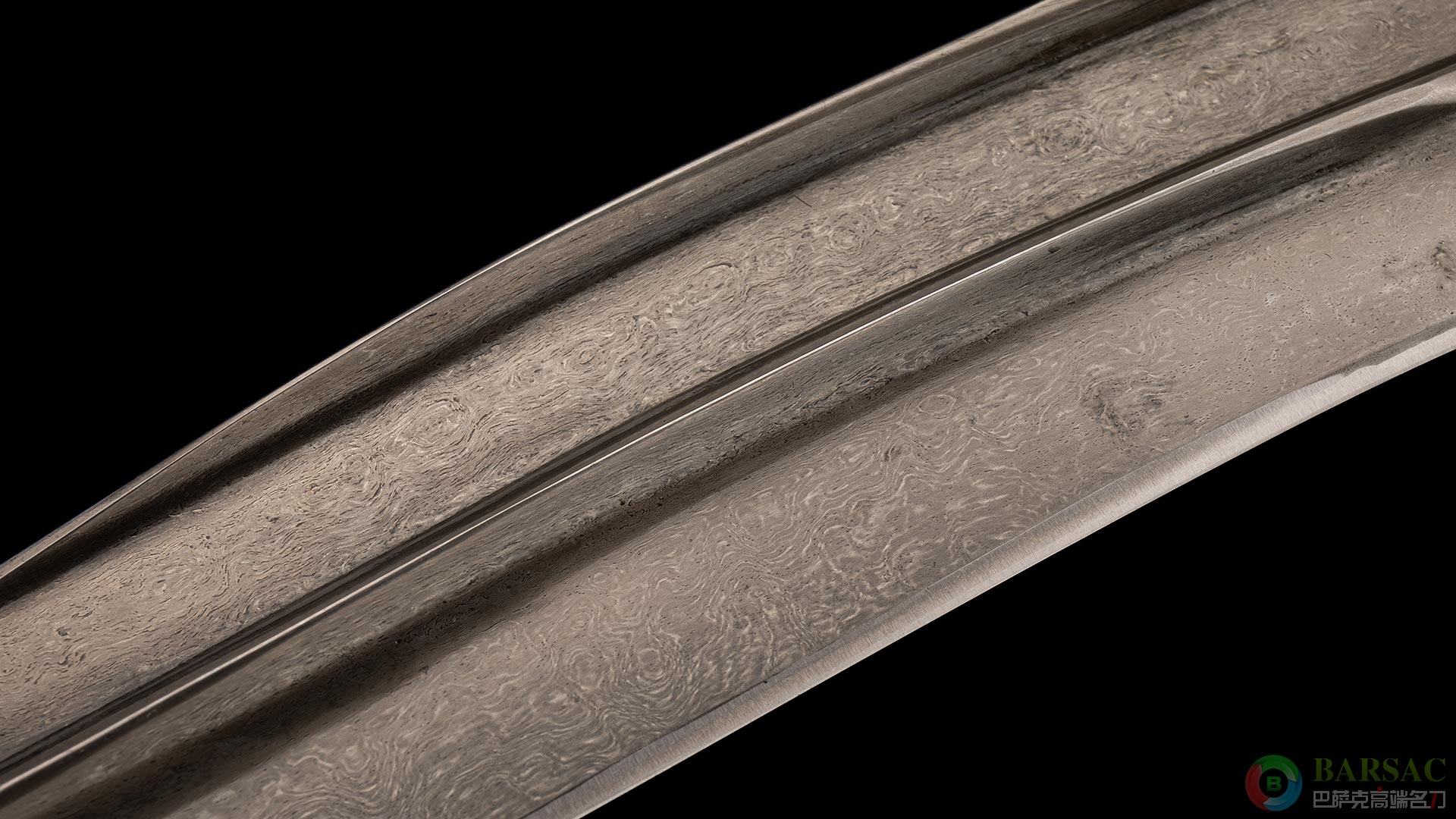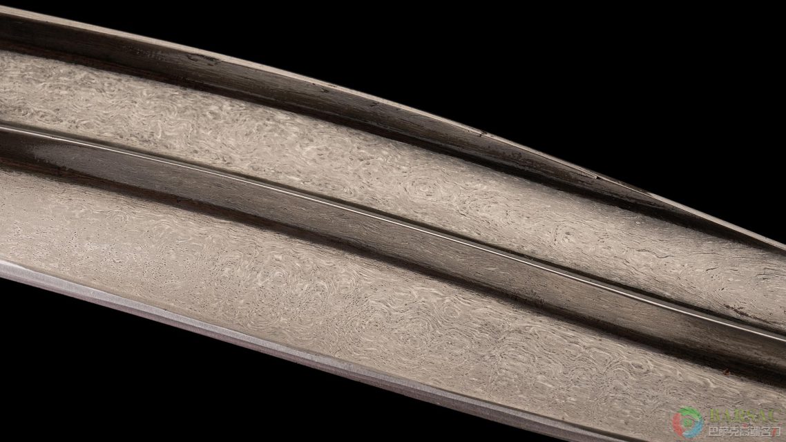 这款斗士弯刀作品刀身采用乌兹钢打造而成,花纹细密连贯,散发着魔性的光辉,又显得非常沉稳内敛。刀刃借鉴西亚经典古兵样式,中间与刀背带有高耸的脊线,这种设计不仅使得刀刃薄而锋利,也使得尖部与中心异常强壮,带有破甲功能;视觉效果也更加立体,如同浮雕也让人倍感寒意。
