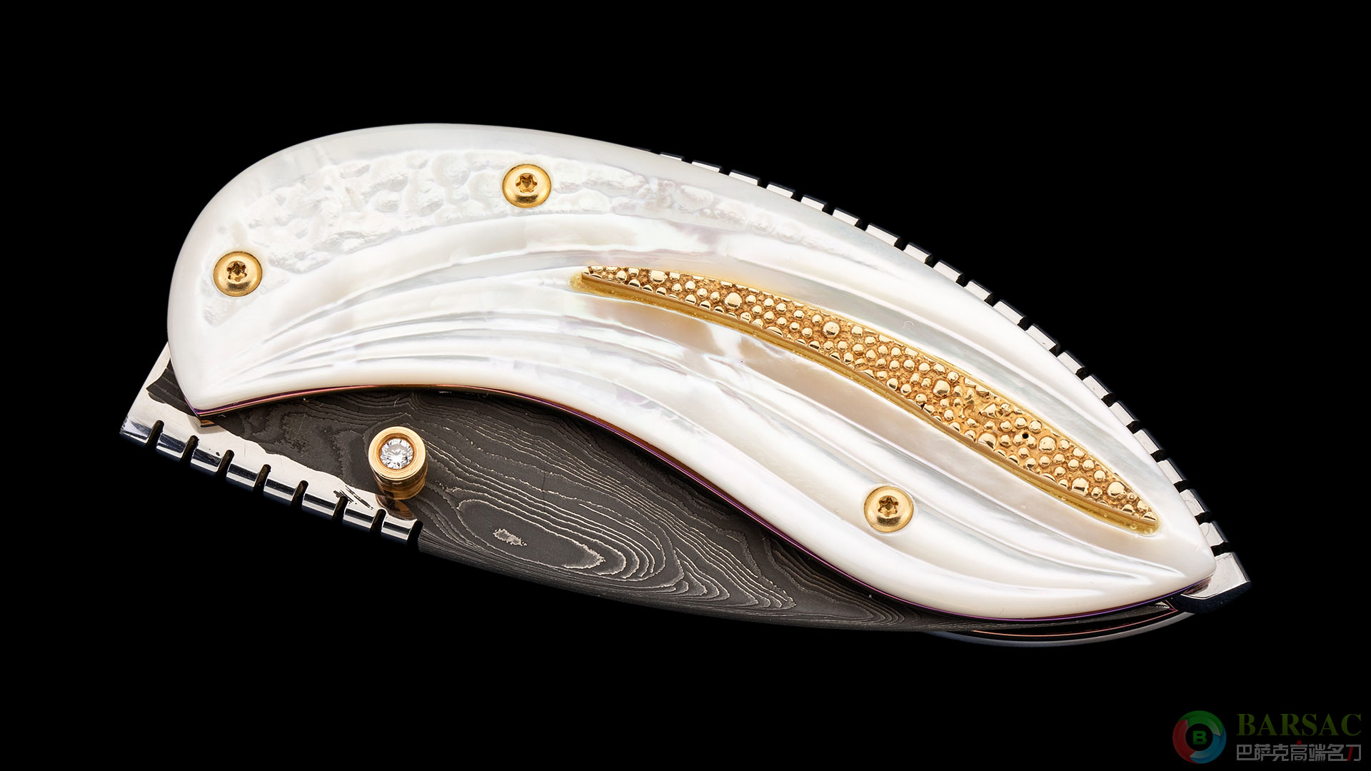 这款白天鹅是一把趣致生动的小刀,如同掌上珠宝,发刃采用大马士革钢制作,纹理连贯动感,搭配钻石黄金推钮,开刀手感顺滑细腻。刀柄采用精品珍珠贝母制作,表面带有柔美动感的线条与肌理雕刻,在光线照射下欣赏更是绚烂无比。贝母上还镶嵌了大块黄金加持,华丽满满。