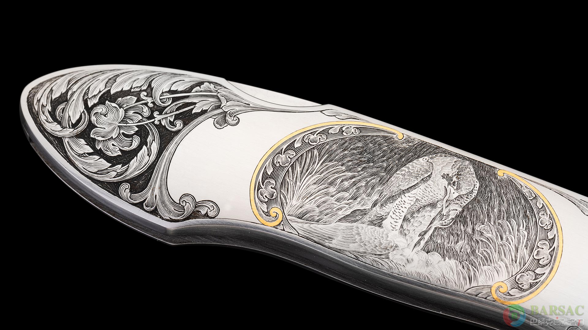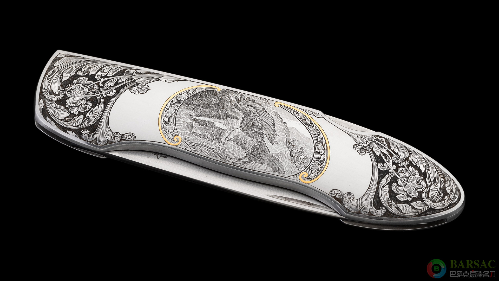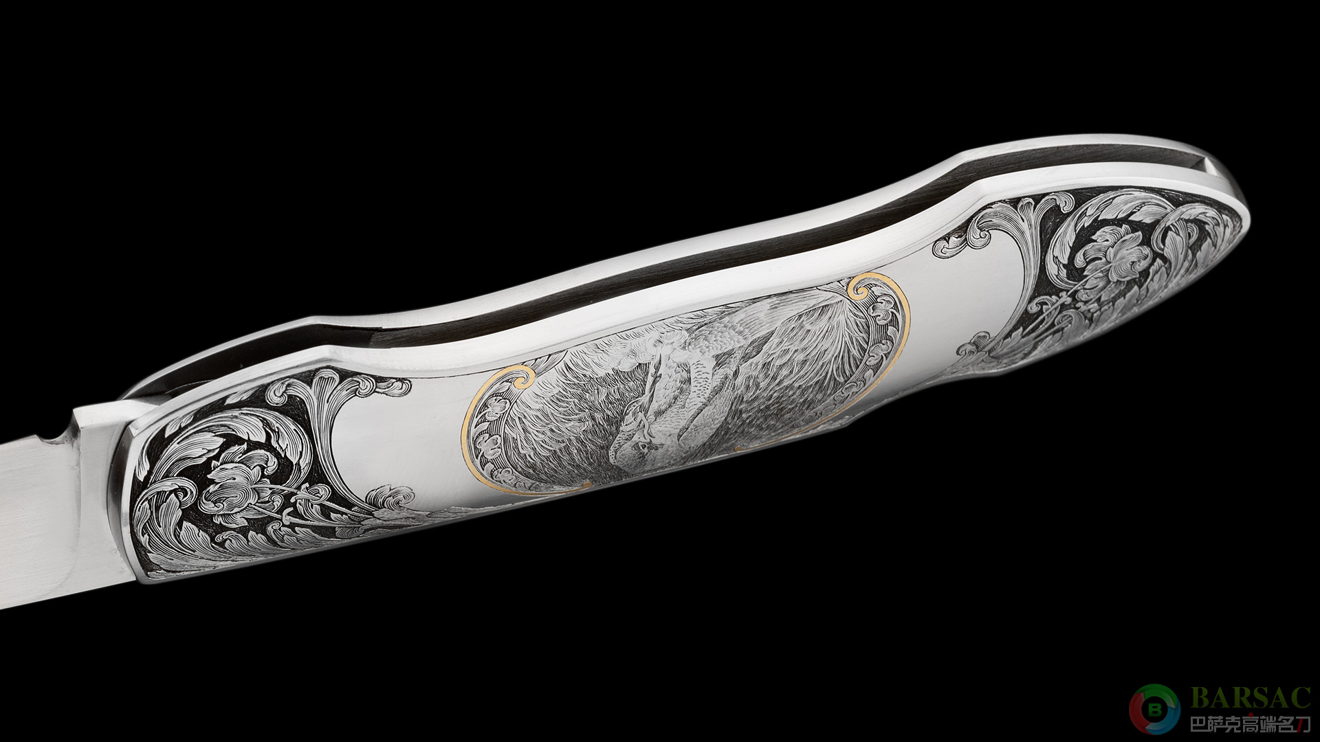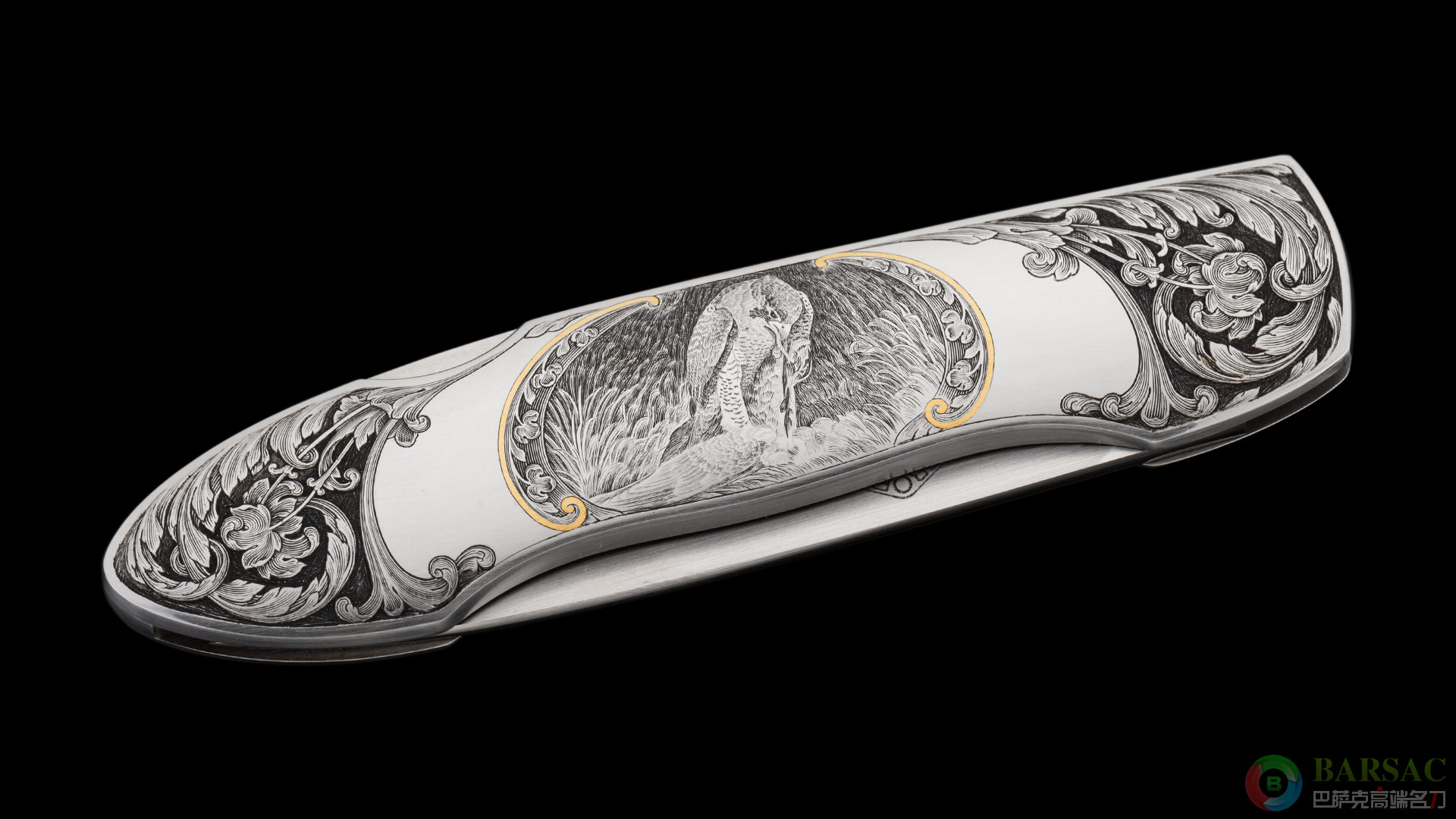 这款银隼作品刀刃采用ATS34不锈钢制作,手工缎面拉丝处理,笔直细腻。刀柄为416不锈钢,双面满雕精美的银隼图案,动感传神,细节细腻生动,局部区域采用黄金镶嵌点缀,优雅奢华。整件作品外形简练,采用背锁设计,是近乎完美的绅士折刀之选。