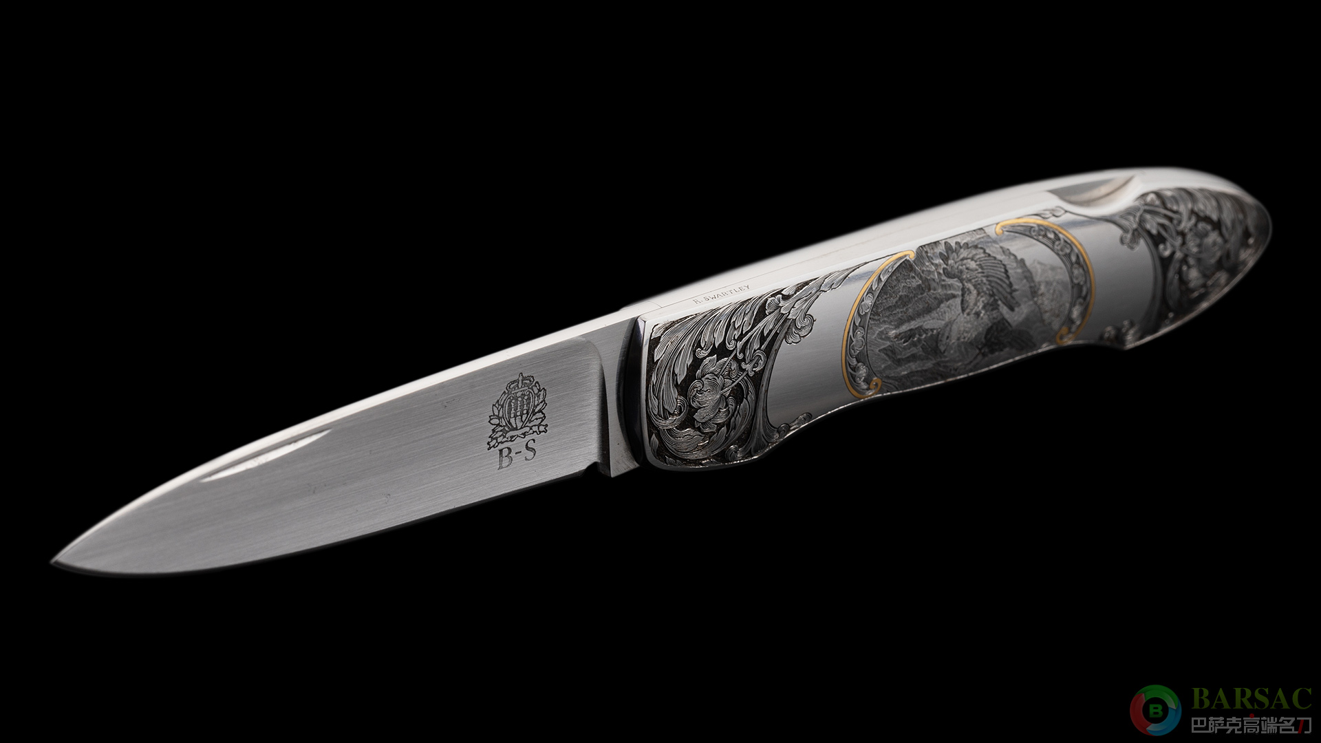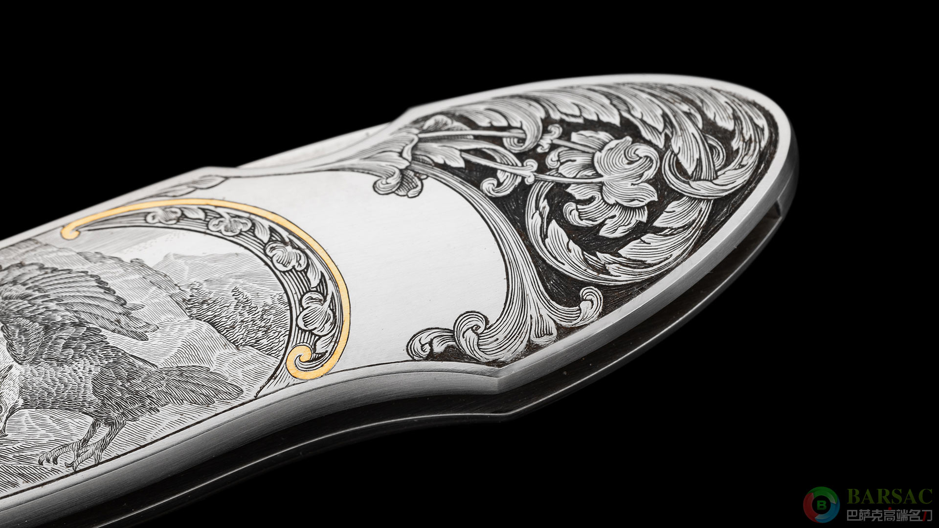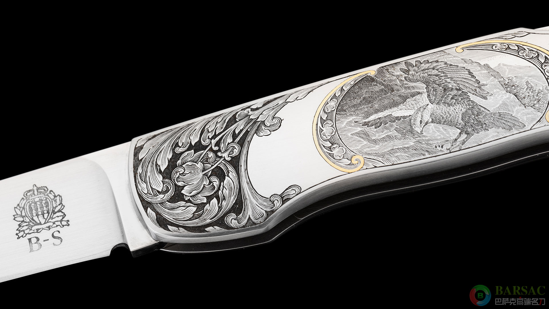 这款银隼作品刀刃采用ATS34不锈钢制作,手工缎面拉丝处理,笔直细腻。刀柄为416不锈钢,双面满雕精美的银隼图案,动感传神,细节细腻生动,局部区域采用黄金镶嵌点缀,优雅奢华。整件作品外形简练,采用背锁设计,是近乎完美的绅士折刀之选。