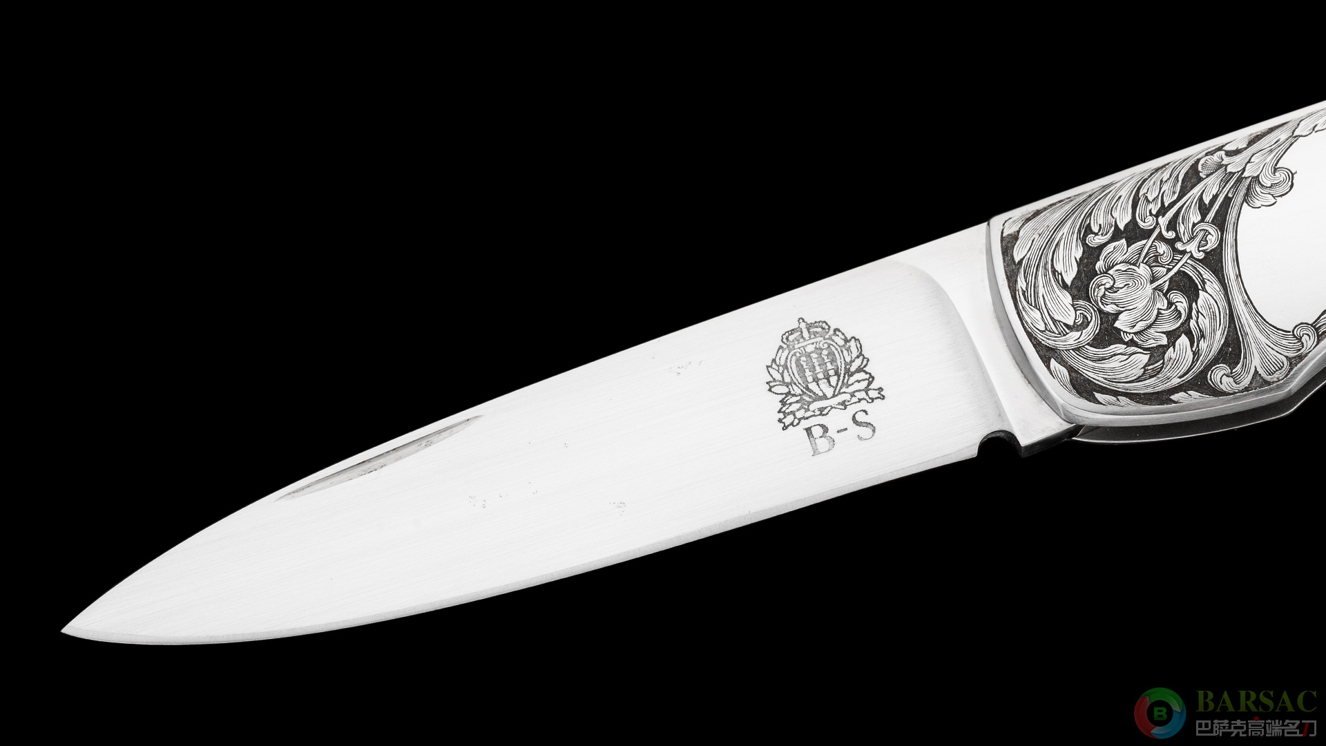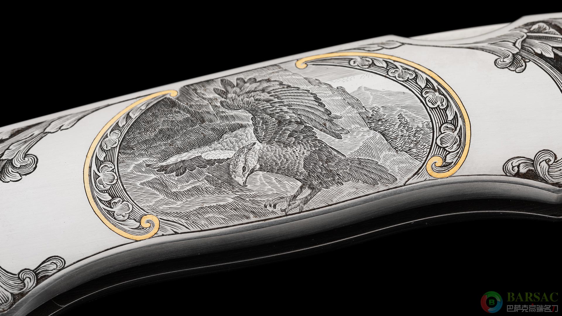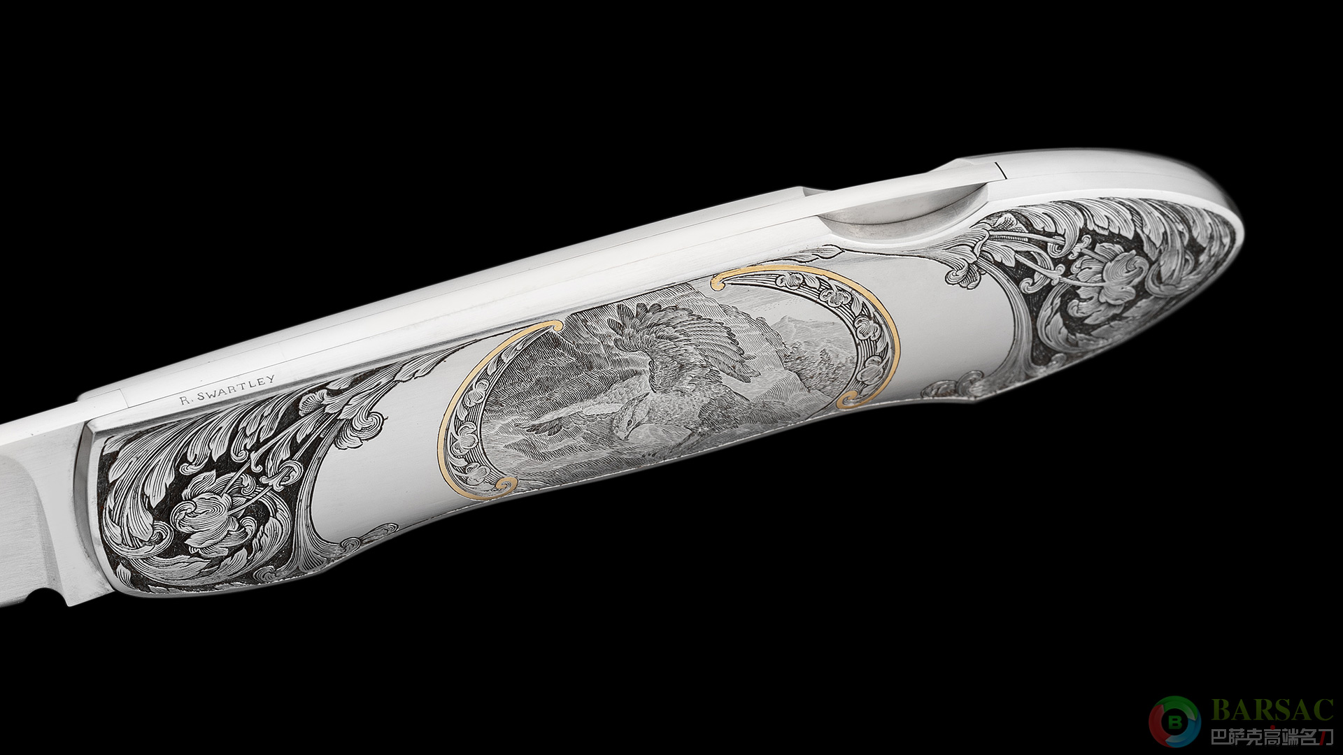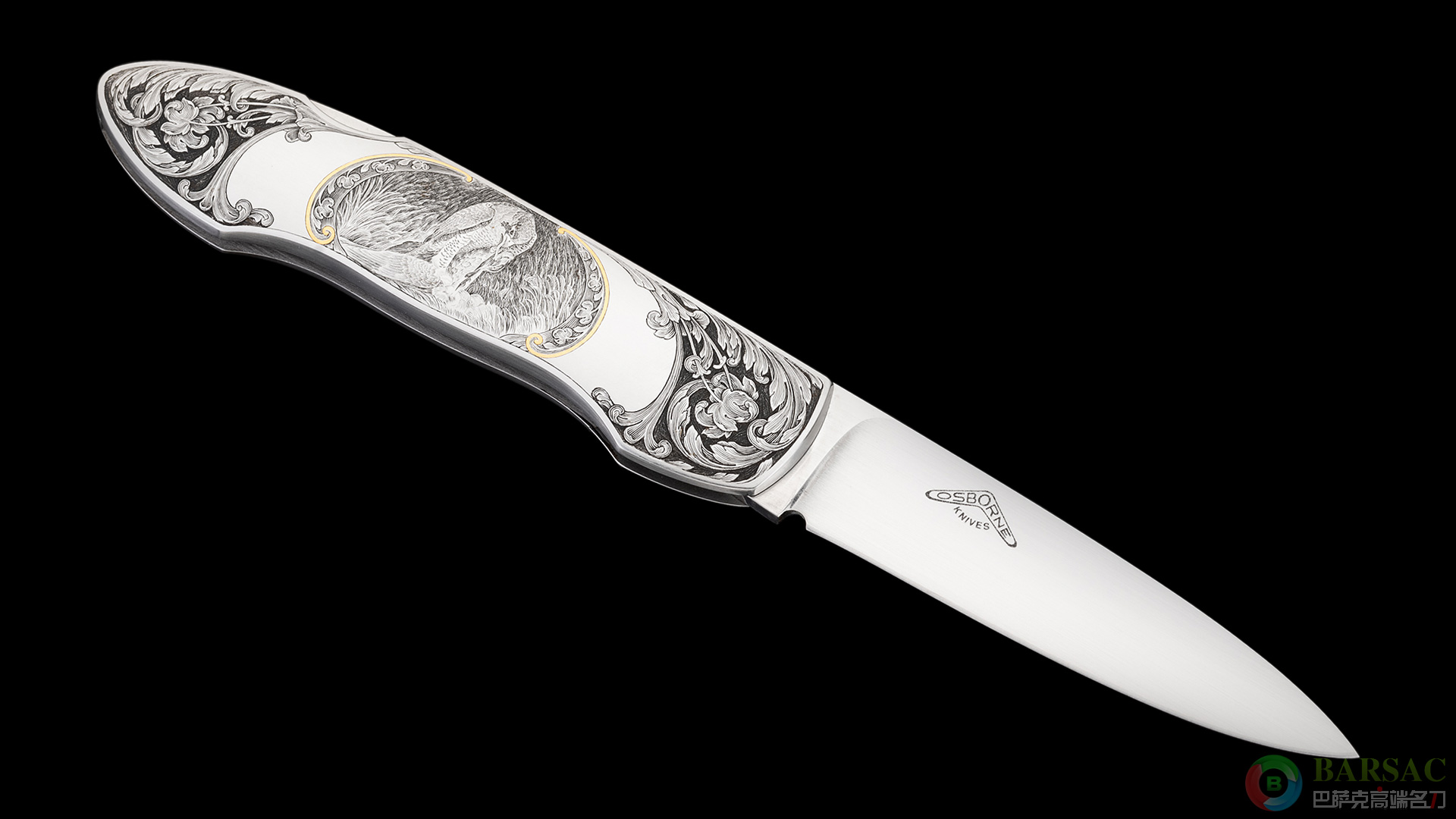 这款银隼作品刀刃采用ATS34不锈钢制作,手工缎面拉丝处理,笔直细腻。刀柄为416不锈钢,双面满雕精美的银隼图案,动感传神,细节细腻生动,局部区域采用黄金镶嵌点缀,优雅奢华。整件作品外形简练,采用背锁设计,是近乎完美的绅士折刀之选。