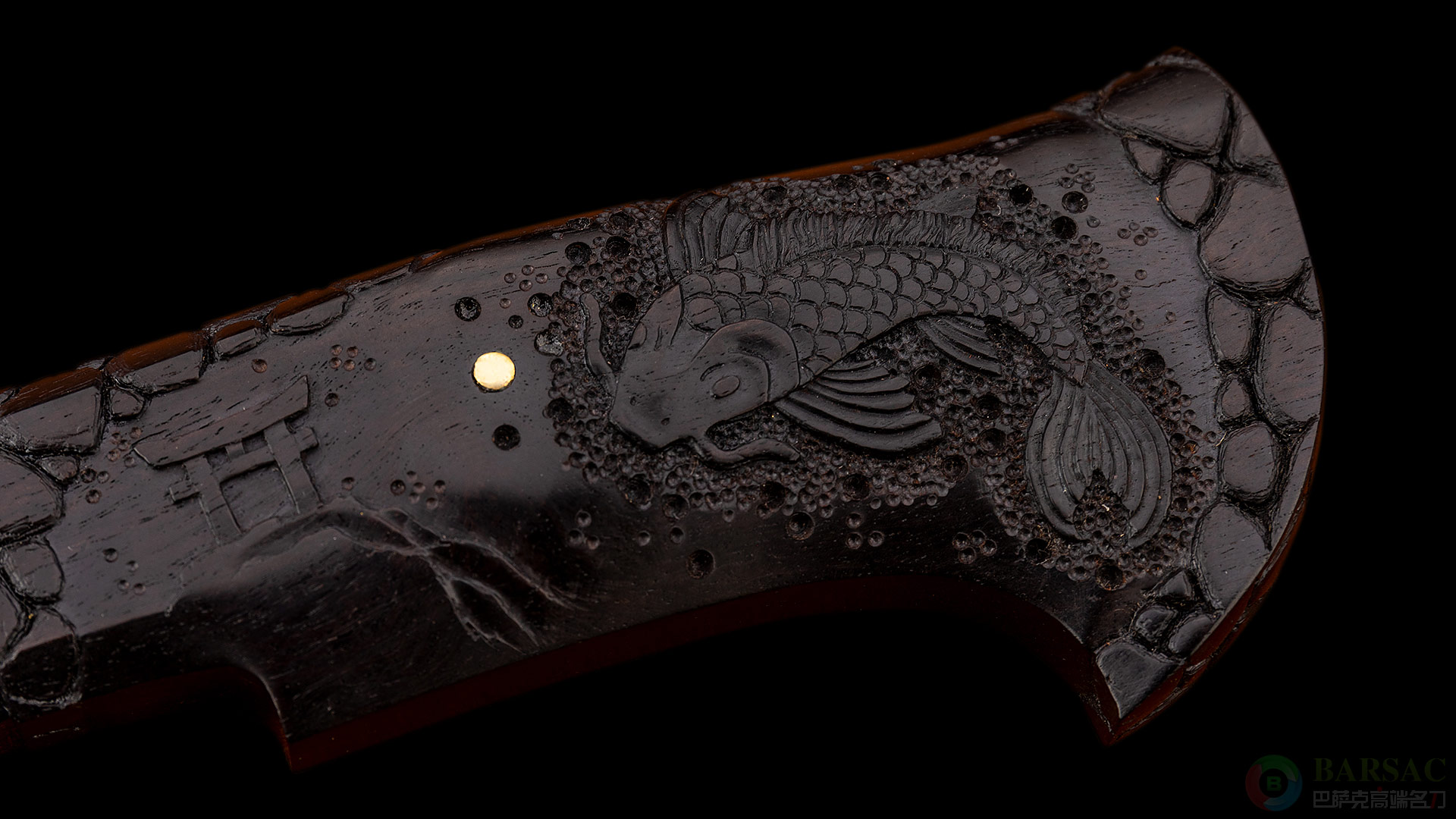 刀柄采用精美乌木制成,雕刻了一条生动的鲤鱼浮雕,鲤鱼摆动着强健身姿向着远方的龙门一跃而起;刀柄还镶嵌了黄金铆钉,以此来比拟日月之辉。整件作品设计巧妙,将大马士革花纹与雕刻装饰融为一体,相互烘托来表达主题意境,意境高远。配有手工皮鞘。