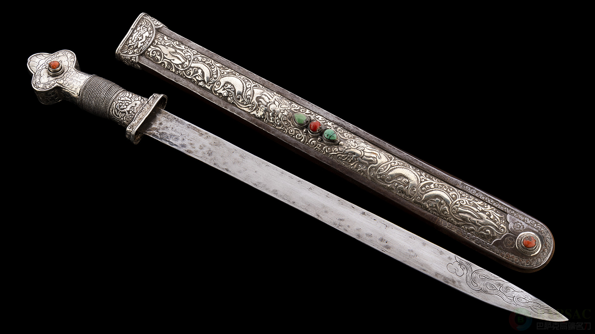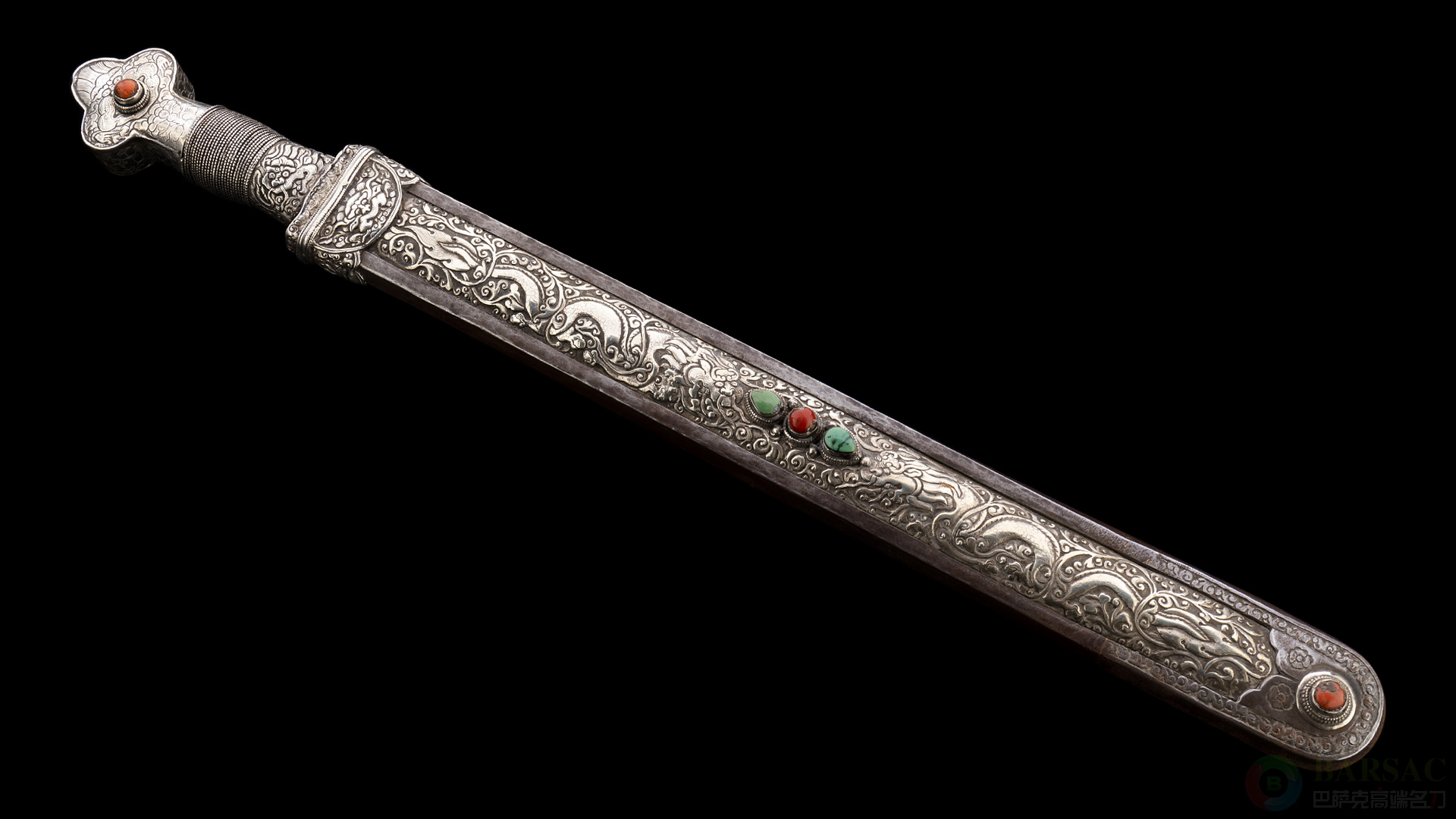 刀柄正中镶嵌红珊瑚装饰,起到点睛之笔。刀鞘份量十足,采用铁质框架,两端以及中部采用银制装具组合,装具一侧刻画了精美的游龙浮雕,另一侧刻画了莲台卷叶等佛教图案。刀鞘中部与前端还镶嵌了红珊瑚,绿松石作为点缀。