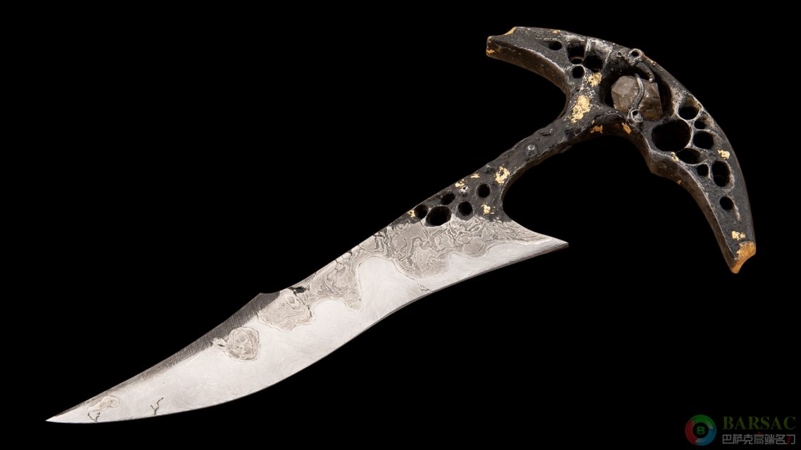 圣奥宾流星约45亿年前来到地球,坠落在法国奥布香槟地区,经过研究发现它含有高浓度的黄金成分。刀柄镂空雕刻,保留粗犷的外观,如同一块天然神秘金属慢慢被研磨成寒光四射的刀刃一般;刀柄中部镶嵌了一颗赫尔基蒙天然闪灵钻,如同为整件作品赋予了法力加持,再加上表面的黄金鎏金装饰,魔幻气息爆棚。