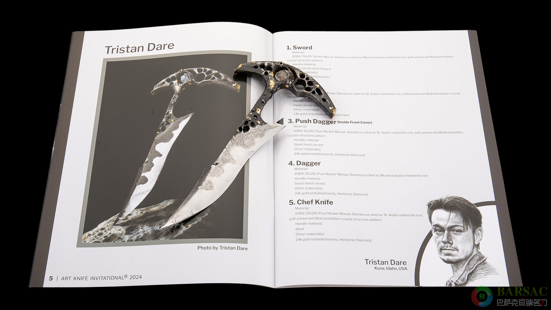 2024年AKI刀展藏品,史上最年轻参加AKI的天才帅气刀匠特里斯坦·达尔手工打造,孤品唯一。特里斯坦年仅21岁,14岁开始锻造制刀。特里斯坦的工作室坐落在美国爱达荷州,其年纪轻轻就已经形成了自己成熟的作品风格,他的设计不仅独树一帜,还特别喜爱运用陨石做刀;他认为天铁作为最原始的高级锻刀材料一直以来带有神秘的色彩,这是一种比人类历史久远许多的天外馈赠,有着任何现代材料所无法替代的艺术内涵。