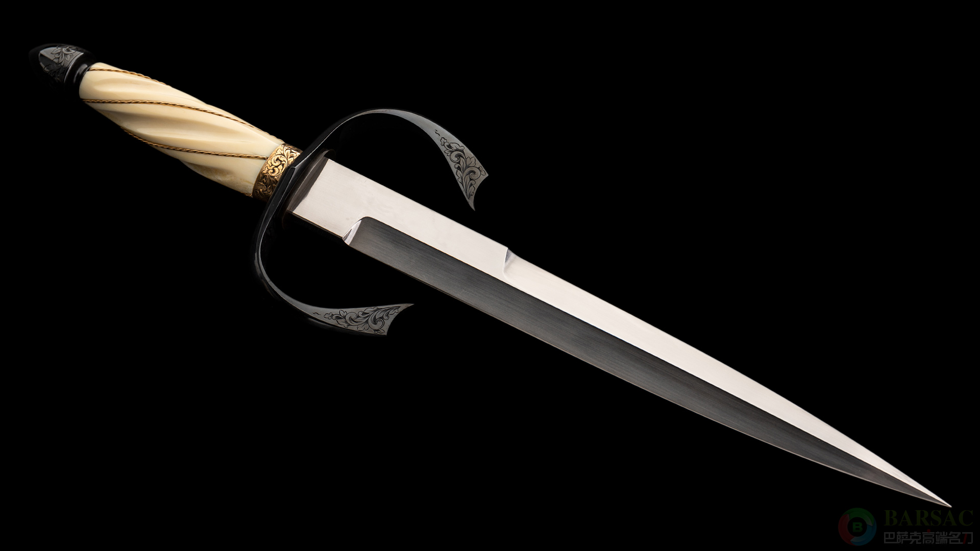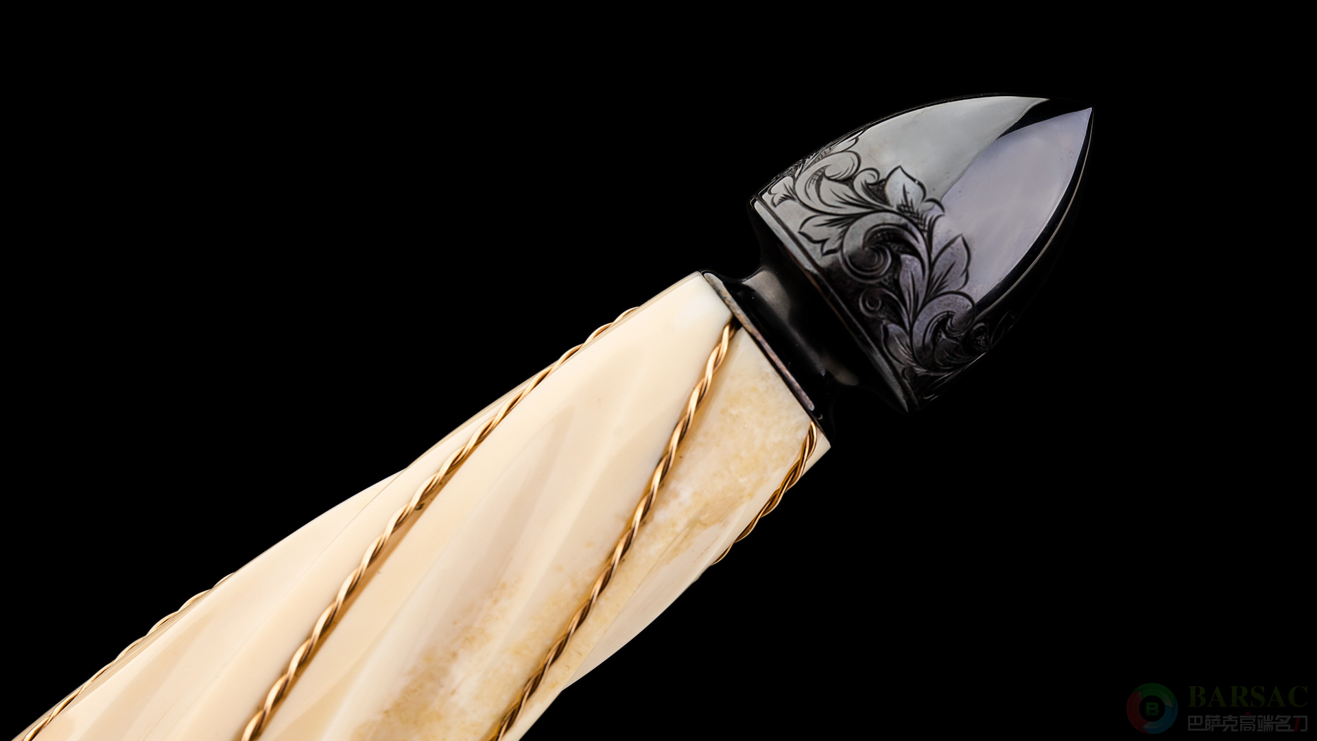 剑柄精选优质海象牙化石雕刻而成,传统扭花剑柄,镶嵌黄金丝链,握感细腻,外观奢华大气。好刀配好鞘,手工牛皮刀鞘收纳,满铠甲纹压花。此件作品色调沉稳内抿,搭配经典的设计更显优雅气质,刀颈一抹亮丽的金色也点亮了整件作品,收藏佳作,值得细细品味。